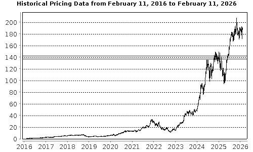 The graph below illustrates the performance of NVIDIA's common stock for the period indicated, based on the daily closing levels as reported by Bloomberg, without independent verification. UBS has not conducted any independent review or due diligence of any publicly available information obtained from Bloomberg. The solid lines represent its coupon barrier and downside threshold of $142.54 and $136.84, which are equal to 75.00% and 72.00%, respectively of the closing level on February 11, 2026. Past performance of the underlying asset is not indicative of the future performance of the underlying asset during the term of the Notes. |