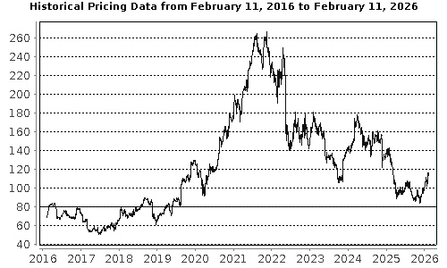 The graph below illustrates the performance of Target's common stock for the period indicated, based on the daily closing levels as reported by Bloomberg, without independent verification. UBS has not conducted any independent review or due diligence of any publicly available information obtained from Bloomberg. The solid line represents its coupon barrier and downside threshold of $80.23, which is equal to 70.00% of the closing level on February 11, 2026. Past performance of the underlying asset is not indicative of the future performance of the underlying asset during the term of the Notes. |