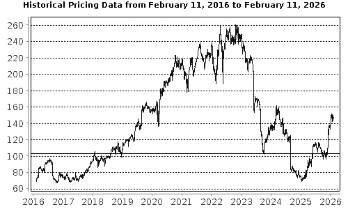 The graph below illustrates the performance of Dollar General's common stock for the period indicated, based on the daily closing levels as reported by Bloomberg, without independent verification. UBS has not conducted any independent review or due diligence of any publicly available information obtained from Bloomberg. The solid line represents its coupon barrier and downside threshold of $103.01, which is equal to 70.00% of the closing level on February 11, 2026. Past performance of the underlying asset is not indicative of the future performance of the underlying asset during the term of the Notes. |