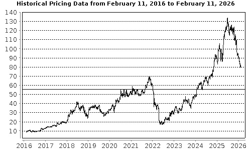 The graph below illustrates the performance of Netflix's common stock for the period indicated, based on the daily closing levels as reported by Bloomberg, without independent verification. UBS has not conducted any independent review or due diligence of any publicly available information obtained from Bloomberg. The solid line represents its coupon barrier and downside threshold of $55.73, which is equal to 70.00% of the closing level on February 11, 2026. Past performance of the underlying asset is not indicative of the future performance of the underlying asset during the term of the Notes. |