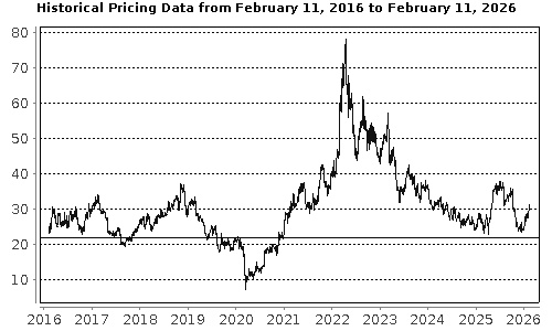 The graph below illustrates the performance of Mosaic's common stock for the period indicated, based on the daily closing levels as reported by Bloomberg, without independent verification. UBS has not conducted any independent review or due diligence of any publicly available information obtained from Bloomberg. The solid line represents its coupon barrier and downside threshold of $21.80, which is equal to 70.00% of the closing level on February 11, 2026. Past performance of the underlying asset is not indicative of the future performance of the underlying asset during the term of the Notes. |