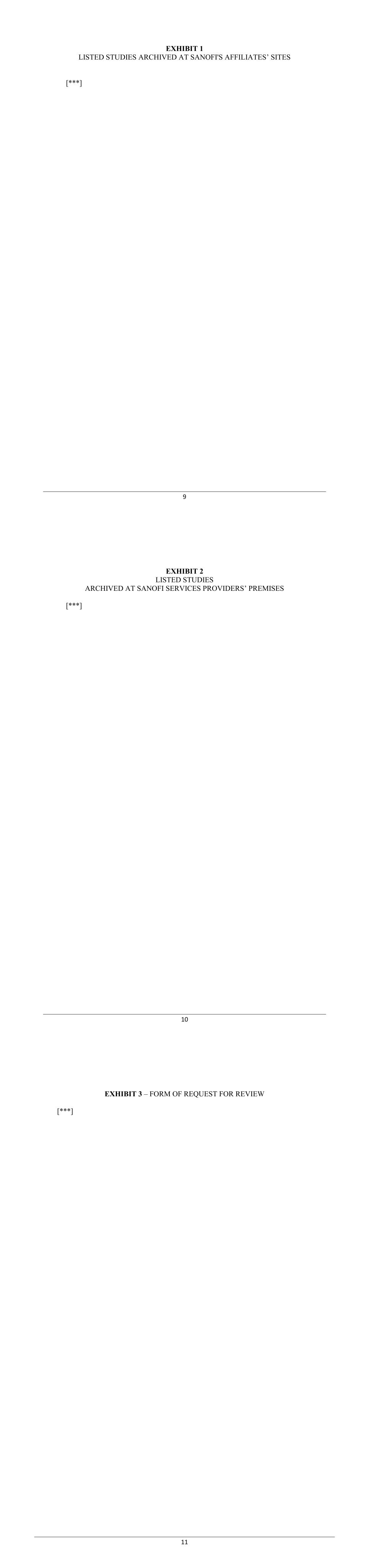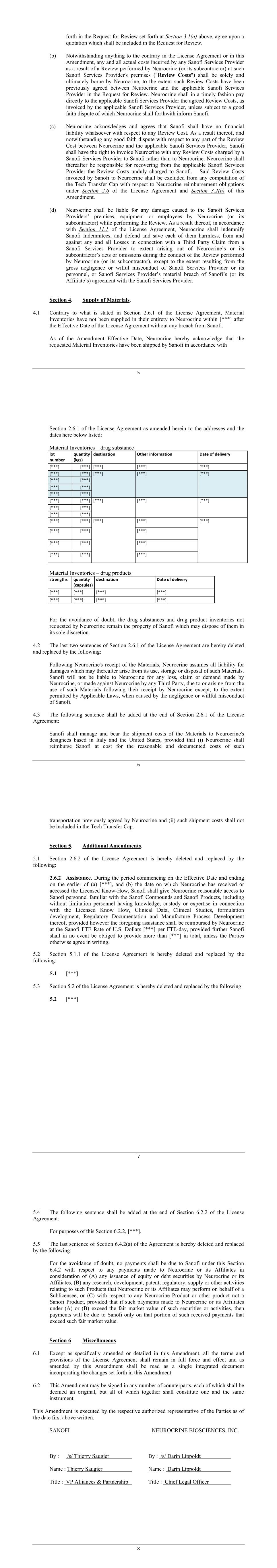 5 forth in the Request for Review set forth at Section 3.1(a) above, agree upon a quotation which shall be included in the Request for Review. (b) Notwithstanding anything to the contrary in the License Agreement or in this Amendment, any and all actual costs incurred by any Sanofi Services Provider as a result of a Review performed by Neurocrine (or its subcontractor) at such Sanofi Services Provider's premises ("Review Costs") shall be solely and ultimately borne by Neurocrine, to the extent such Review Costs have been previously agreed between Neurocrine and the applicable Sanofi Services Provider in the Request for Review. Neurocrine shall in a timely fashion pay directly to the applicable Sanofi Services Provider the agreed Review Costs, as invoiced by the applicable Sanofi Services Provider, unless subject to a good faith dispute of which Neurocrine shall forthwith inform Sanofi. (c) Neurocrine acknowledges and agrees that Sanofi shall have no financial liability whatsoever with respect to any Review Cost. As a result thereof, and notwithstanding any good faith dispute with respect to any part of the Review Cost between Neurocrine and the applicable Sanofi Services Provider, Sanofi shall have the right to invoice Neurocrine with any Review Costs charged by a Sanofi Services Provider to Sanofi rather than to Neurocrine. Neurocrine shall thereafter be responsible for recovering from the applicable Sanofi Services Provider the Review Costs unduly charged to Sanofi. Said Review Costs invoiced by Sanofi to Neurocrine shall be excluded from any computation of the Tech Transfer Cap with respect to Neurocrine reimbursement obligations under Section 2.6 of the License Agreement and Section 3.2(b) of this Amendment. (d) Neurocrine shall be liable for any damage caused to the Sanofi Services Providers’ premises, equipment or employees by Neurocrine (or its subcontractor) while performing the Review. As a result thereof, in accordance with Section 11.1 of the License Agreement, Neurocrine shall indemnify Sanofi Indemnitees, and defend and save each of them harmless, from and against any and all Losses in connection with a Third Party Claim from a Sanofi Services Provider to extent arising out of Neurocrine’s or its subcontractor’s acts or omissions during the conduct of the Review performed by Neurocrine (or its subcontractor), except to the extent resulting from the gross negligence or wilful misconduct of Sanofi Services Provider or its personnel, or Sanofi Services Provider’s material breach of Sanofi’s (or its Affiliate’s) agreement with the Sanofi Services Provider. Section 4. Supply of Materials. 4.1 Contrary to what is stated in Section 2.6.1 of the License Agreement, Material Inventories have not been supplied in their entirety to Neurocrine within [***] after the Effective Date of the License Agreement without any breach from Sanofi. As of the Amendment Effective Date, Neurocrine hereby acknowledge that the requested Material Inventories have been shipped by Sanofi in accordance with 6 Section 2.6.1 of the License Agreement as amended herein to the addresses and the dates here below listed: Material Inventories – drug substance lot number quantity (kgs) destination Other information Date of delivery [***] [***] [***] [***] [***] [***] [***] [***] [***] [***] [***] [***] [***] [***] [***] [***] [***] [***] [***] [***] [***] [***] [***] [***] [***] [***] [***] [***] [***] [***] [***] [***] [***] [***] [***] [***] [***] [***] [***] Material Inventories – drug products strengths quantity (capsules) destination Date of delivery [***] [***] [***] [***] [***] [***] [***] [***] For the avoidance of doubt, the drug substances and drug product inventories not requested by Neurocrine remain the property of Sanofi which may dispose of them in its sole discretion. 4.2 The last two sentences of Section 2.6.1 of the License Agreement are hereby deleted and replaced by the following: Following Neurocrine's receipt of the Materials, Neurocrine assumes all liability for damages which may thereafter arise from its use, storage or disposal of such Materials. Sanofi will not be liable to Neurocrine for any loss, claim or demand made by Neurocrine, or made against Neurocrine by any Third Party, due to or arising from the use of such Materials following their receipt by Neurocrine except, to the extent permitted by Applicable Laws, when caused by the negligence or willful misconduct of Sanofi. 4.3 The following sentence shall be added at the end of Section 2.6.1 of the License Agreement: Sanofi shall manage and bear the shipment costs of the Materials to Neurocrine's designees based in Italy and the United States, provided that (i) Neurocrine shall reimburse Sanofi at cost for the reasonable and documented costs of such 7 transportation previously agreed by Neurocrine and (ii) such shipment costs shall not be included in the Tech Transfer Cap. Section 5. Additional Amendments. 5.1 Section 2.6.2 of the License Agreement is hereby deleted and replaced by the following: 2.6.2 Assistance. During the period commencing on the Effective Date and ending on the earlier of (a) [***], and (b) the date on which Neurocrine has received or accessed the Licensed Know-How, Sanofi shall give Neurocrine reasonable access to Sanofi personnel familiar with the Sanofi Compounds and Sanofi Products, including without limitation personnel having knowledge, custody or expertise in connection with the Licensed Know How, Clinical Data, Clinical Studies, formulation development, Regulatory Documentation and Manufacture Process Development thereof, provided however the foregoing assistance shall be reimbursed by Neurocrine at the Sanofi FTE Rate of U.S. Dollars [***] per FTE-day, provided further Sanofi shall in no event be obliged to provide more than [***] in total, unless the Parties otherwise agree in writing. 5.2 Section 5.1.1 of the License Agreement is hereby deleted and replaced by the following: 5.1 [***] 5.3 