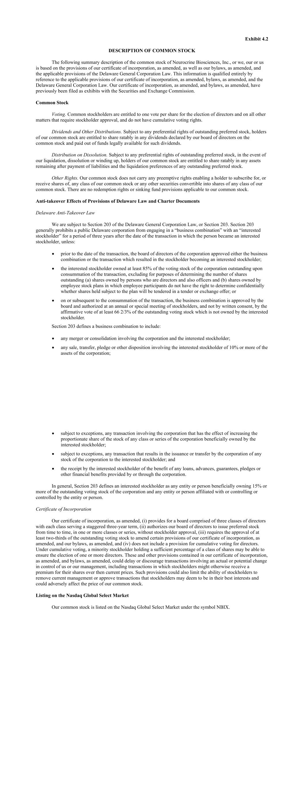 Exhibit 4.2 DESCRIPTION OF COMMON STOCK The following summary description of the common stock of Neurocrine Biosciences, Inc., or we, our or us is based on the provisions of our certificate of incorporation, as amended, as well as our bylaws, as amended, and the applicable provisions of the Delaware General Corporation Law. This information is qualified entirely by reference to the applicable provisions of our certificate of incorporation, as amended, bylaws, as amended, and the Delaware General Corporation Law. Our certificate of incorporation, as amended, and bylaws, as amended, have previously been filed as exhibits with the Securities and Exchange Commission. Common Stock Voting. Common stockholders are entitled to one vote per share for the election of directors and on all other matters that require stockholder approval, and do not have cumulative voting rights. Dividends and Other Distributions. Subject to any preferential rights of outstanding preferred stock, holders of our common stock are entitled to share ratably in any dividends declared by our board of directors on the common stock and paid out of funds legally available for such dividends. Distribution on Dissolution. Subject to any preferential rights of outstanding preferred stock, in the event of our liquidation, dissolution or winding up, holders of our common stock are entitled to share ratably in any assets remaining after payment of liabilities and the liquidation preferences of any outstanding preferred stock. Other Rights. Our common stock does not carry any preemptive rights enabling a holder to subscribe for, or receive shares of, any class of our common stock or any other securities convertible into shares of any class of our common stock. There are no redemption rights or sinking fund provisions applicable to our common stock. Anti-takeover Effects of Provisions of Delaware Law and Charter Documents Delaware Anti-Takeover Law We are subject to Section 203 of the Delaware General Corporation Law, or Section 203. Section 203 generally prohibits a public Delaware corporation from engaging in a “business combination” with an “interested stockholder” for a period of three years after the date of the transaction in which the person became an interested stockholder, unless: • prior to the date of the transaction, the board of directors of the corporation approved either the business combination or the transaction which resulted in the stockholder becoming an interested stockholder; • the interested stockholder owned at least 85% of the voting stock of the corporation outstanding upon consummation of the transaction, excluding for purposes of determining the number of shares outstanding (a) shares owned by persons who are directors and also officers and (b) shares owned by employee stock plans in which employee participants do not have the right to determine confidentially whether shares held subject to the plan will be tendered in a tender or exchange offer; or • on or subsequent to the consummation of the transaction, the business combination is approved by the board and authorized at an annual or special meeting of stockholders, and not by written consent, by the affirmative vote of at least 66 2/3% of the outstanding voting stock which is not owned by the interested stockholder. Section 203 defines a business combination to include: • any merger or consolidation involving the corporation and the interested stockholder; • any sale, transfer, pledge or other disposition involving the interested stockholder of 10% or more of the assets of the corporation; • subject to exceptions, any transaction involving the corporation that has the effect of increasing the proportionate share of the stock of any class or series of the corporation beneficially owned by the interested stockholder; • subject to exceptions, any transaction that results in the issuance or transfer by the corporation of any stock of the corporation to the interested stockholder; and • the receipt by the interested stockholder of the benefit of any loans, advances, guarantees, pledges or other financial benefits provided by or through the corporation. In general, Section 203 defines an interested stockholder as any entity or person beneficially owning 15% or more of the outstanding voting stock of the corporation and any entity or person affiliated with or controlling or controlled by the entity or person. Certificate of Incorporation Our certificate of incorporation, as amended, (i) provides for a board comprised of three classes of directors with each class serving a staggered three-year term, (ii) authorizes our board of directors to issue preferred stock from time to time, in one or more classes or series, without stockholder approval, (iii) requires the approval of at least two-thirds of the outstanding voting stock to amend certain provisions of our certificate of incorporation, as amended, and our bylaws, as amended, and (iv) does not include a provision for cumulative voting for directors. Under cumulative voting, a minority stockholder holding a sufficient percentage of a class of shares may be able to ensure the election of one or more directors. These and other provisions contained in our certificate of incorporation, as amended, and bylaws, as amended, could delay or discourage transactions involving an actual or potential change in control of us or our management, including transactions in which stockholders might otherwise receive a premium for their shares over then current prices. Such provisions could also limit the ability of stockholders to remove current management or approve transactions that stockholders may deem to be in their best interests and could adversely affect the price of our common stock. Listing on the Nasdaq Global Select Market Our common stock is listed on the Nasdaq Global Select Market under the symbol NBIX.
