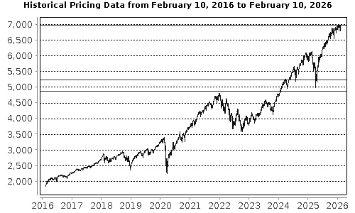 The graph below illustrates the performance of the S&P 500® Index for the period indicated, based on the daily closing levels as reported by Bloomberg, without independent verification. UBS has not conducted any independent review or due diligence of any publicly available information obtained from Bloomberg. The solid lines respectively represent its call threshold level of 6,964.82, which is equal to 100.00% of the closing level on February 09, 2026, its coupon barrier of 5,223.62, which is equal to 75.00% of the closing level on February 09, 2026, and its downside threshold of 4,875.37, which is equal to 70.00% of the closing level on February 09, 2026. Past performance of the underlying asset is not indicative of the future performance of the underlying asset during the term of the Notes. |