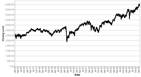 The graph below illustrates the performance of the S&P 500® Index from January 4, 2016 to February 9, 2025. The closing level of the S&P 500® Index on February 9, 2025 was 6,964.82. We obtained the closing levels of the S&P 500® Index from Bloomberg, and we have not participated in the preparation of or verified such information. The historical closing levels of the S&P 500® Index should not be taken as an indication of future performance and no assurance can be given as to the final underlying level or any future closing level of the S&P 500® Index. We cannot give you assurance that the performance of the S&P 500® Index will result in a positive return on your initial investment and you could lose a significant portion or all of the stated principal amount at maturity.