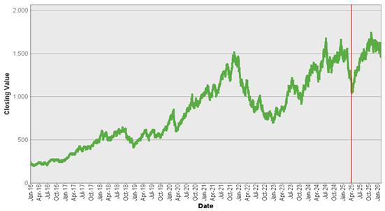 The closing value of the underlying on February 9, 2026 was 1,523.895. The graph below shows the hypothetical back-tested closing values of the underlying for the period from January 4, 2016 to April 25, 2025, and historical closing values of the underlying for the period April 28, 2025 to February 9, 2026. All data to the left of the vertical red line in the graph below are hypothetical and back-tested. We obtained the closing values from Bloomberg L.P., without independent verification. You should not take the hypothetical back-tested and historical values of the underlying as an indication of future performance.