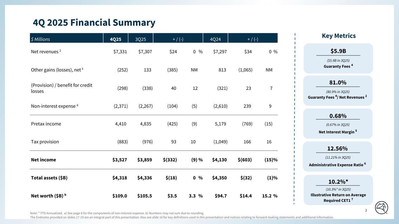 The Endnotes provided on slides 17-19 are an integral part of this presentation. Also see slide 16 for key definitions used in this presentation and notices relating to forward-looking statements and additional information. 1 Special Colors #edebe9 #898989 #cff2f2 Categorical Color Palette #05314d #1c6fa3 #898989 #4d4d4d #5dc7d0 #c55422 #2c6937 For callout boxes Use in rounded shape Sequential Color Palette #121212 #05314d #085280 #1c6fa3 #509ed5 #98c6e6 Line graph Color Palette #c44786 (refrain from using) #085280 #5dc7d0 #898989 #e66e39 #418152 #ffb400 4Q and Full Year 2025 Key Highlights Page align Top align Enhanced operational effectiveness and effectively reduced costs Remained committed to disciplined financial and risk management Developed innovative market solutions We are stronger, more effective, and better positioned for the future. $3.5B 4Q25 Net Income ($3.9B in 3Q25) $14.4B FY25 Net Income ($17.0B in 2024) $109.0B YE25 Net Worth 1 ($94.7B as of YE24) Financial Performance Mission Performance 4Q25 FY25 $123B $409B Liquidity provided to the mortgage market 449K 1.5M Households helped to buy, refinance, or rent a home Company Impact
