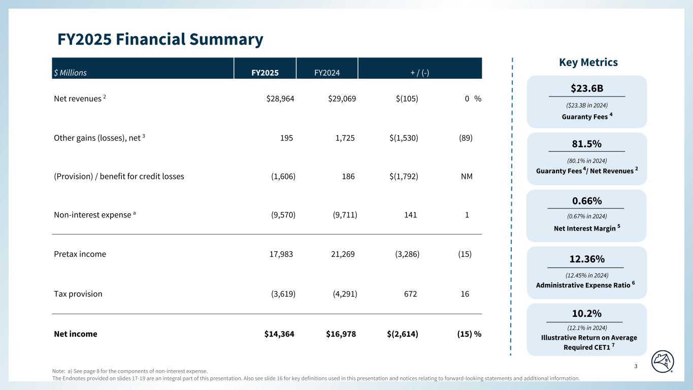 The Endnotes provided on slides 17-19 are an integral part of this presentation. Also see slide 16 for key definitions used in this presentation and notices relating to forward-looking statements and additional information. 2 Special Colors #edebe9 #898989 #cff2f2 Categorical Color Palette #05314d #1c6fa3 #898989 #4d4d4d #5dc7d0 #c55422 #2c6937 For callout boxes Use in rounded shape Sequential Color Palette #121212 #05314d #085280 #1c6fa3 #509ed5 #98c6e6 Line graph Color Palette #c44786 (refrain from using) #085280 #5dc7d0 #898989 #e66e39 #418152 #ffb400 $ Millions 4Q25 3Q25 + / (-) 4Q24 + / (-) Net revenues 2 $7,331 $7,307 $24 0 % $7,297 $34 0 % Other gains (losses), net 3 (252) 133 (385) NM 813 (1,065) NM (Provision) / benefit for credit losses (298) (338) 40 12 (321) 23 7 Non-interest expense a (2,371) (2,267) (104) (5) (2,610) 239 9 Pretax income 4,410 4,835 (425) (9) 5,179 (769) (15) Tax provision (883) (976) 93 10 (1,049) 166 16 Net income $3,527 $3,859 $(332) (9) % $4,130 $(603) (15) % Total assets ($B) $4,318 $4,336 $(18) 0 % $4,350 $(32) (1) % Net worth ($B) b $109.0 $105.5 $3.5 3.3 % $94.7 $14.4 15.2 % 4Q 2025 Financial Summary Key Metrics Guaranty Fees 4/ Net Revenues 2 0.68% Net Interest Margin 5 12.56% Administrative Expense Ratio 6 10.2%* Illustrative Return on Average Required CET1 7 (80.9% in 3Q25) (10.3%* in 3Q25) (0.67% in 3Q25) (11.21% in 3Q25) 81.0% $5.9B Guaranty Fees 4 ($5.9B in 3Q25) Page align Note: * YTD Annualized. a) See page 8 for the components of non-interest expense. b) Numbers may not sum due to rounding. Bottom