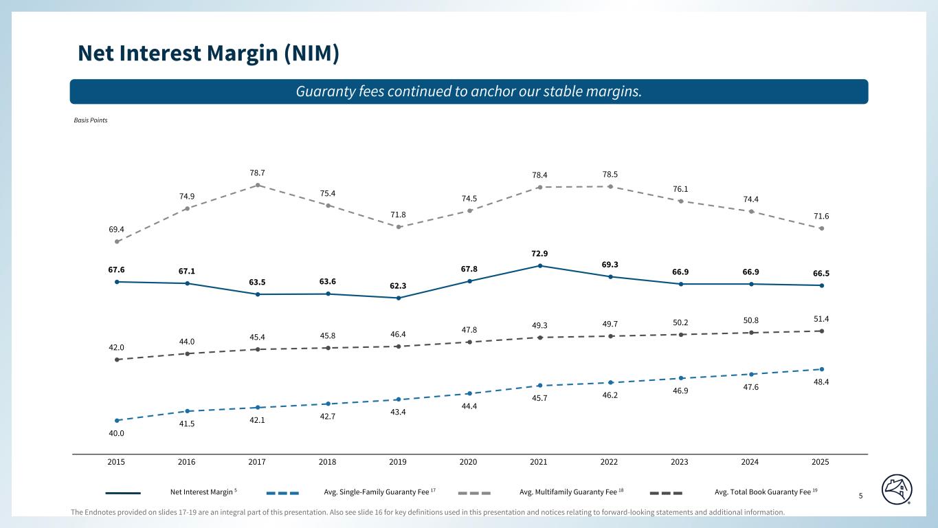 The Endnotes provided on slides 17-19 are an integral part of this presentation. Also see slide 16 for key definitions used in this presentation and notices relating to forward-looking statements and additional information. 4 Special Colors #edebe9 #898989 #cff2f2 Categorical Color Palette #05314d #1c6fa3 #898989 #4d4d4d #5dc7d0 #c55422 #2c6937 For callout boxes Use in rounded shape Sequential Color Palette #121212 #05314d #085280 #1c6fa3 #509ed5 #98c6e6 Line graph Color Palette #c44786 (refrain from using) #085280 #5dc7d0 #898989 #e66e39 #418152 #ffb400 Guaranty Book & Net Interest Income Net Interest IncomeAverage Guaranty Book 8 $ Billions $ Billions $3,752 $4,011 $4,090 $4,109 $4,107 $3,351 $3,586 $3,635 $3,626 $3,593 $401 $425 $455 $483 $514 2021 2022 2023 2024 2025 Single-Family 9 Multifamily 10 $14.2 $16.1 $16.2 $16.5 $17.0 $3.1 $3.3 $3.4 $3.4 $3.4 $11.2 $7.1 $4.0 $3.3 $3.2 $1.1 $2.9 $5.2 $5.5 $5.0 2021 2022 2023 2024 2025 Base Guaranty Fee 11 Deferred Guaranty Fee 12 Portfolios & Other 13TCCA 2025 YoY 30-Year Fixed Mortgage Rate 14 △ $29.6 $29.4 $28.8 $28.7 $28.6 ~25% of U.S. Single-Family Mortgage Debt Outstanding 16 ~21% of U.S. Multifamily Mortgage Debt Outstanding 16 YoY Secured Overnight Financing Rate 15 △ Page align -62.0 bps-70.0 bps Our guaranty business continued to generate the majority of our net interest income.