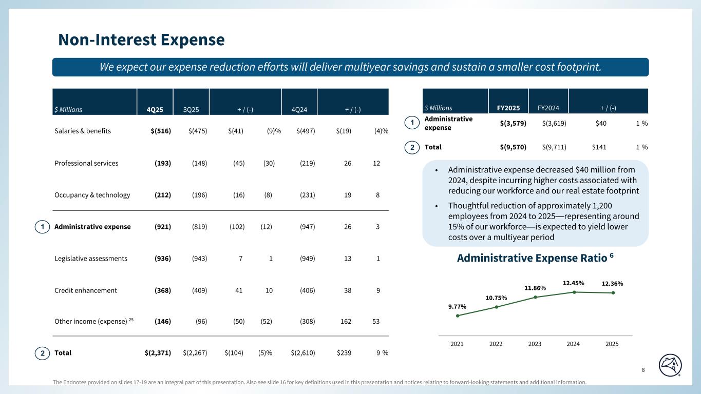 The Endnotes provided on slides 17-19 are an integral part of this presentation. Also see slide 16 for key definitions used in this presentation and notices relating to forward-looking statements and additional information. 8 Special Colors #edebe9 #898989 #cff2f2 Categorical Color Palette #05314d #1c6fa3 #898989 #4d4d4d #5dc7d0 #c55422 #2c6937 For callout boxes Use in rounded shape Sequential Color Palette #121212 #05314d #085280 #1c6fa3 #509ed5 #98c6e6 Line graph Color Palette #c44786 (refrain from using) #085280 #5dc7d0 #898989 #e66e39 #418152 #ffb400 Non-Interest Expense We expect our expense reduction efforts will deliver multiyear savings and sustain a smaller cost footprint. $ Millions 4Q25 3Q25 + / (-) 4Q24 + / (-) Salaries & benefits $(516) $(475) $(41) (9) % $(497) $(19) (4) % Professional services (193) (148) (45) (30) (219) 26 12 Occupancy & technology (212) (196) (16) (8) (231) 19 8 Administrative expense (921) (819) (102) (12) (947) 26 3 Legislative assessments (936) (943) 7 1 (949) 13 1 Credit enhancement (368) (409) 41 10 (406) 38 9 Other income (expense) 25 (146) (96) (50) (52) (308) 162 53 Total $(2,371) $(2,267) $(104) (5) % $(2,610) $239 9 % Administrative Expense Ratio 6 9.77% 10.75% 11.86% 12.45% 12.36% 2021 2022 2023 2024 2025 $ Millions FY2025 FY2024 + / (-) Administrative expense $(3,579) $(3,619) $40 1 % Total $(9,570) $(9,711) $141 1 % Page align • Administrative expense decreased $40 million from 2024, despite incurring higher costs associated with reducing our workforce and our real estate footprint • Thoughtful reduction of approximately 1,200 employees from 2024 to 2025—representing around 15% of our workforce—is expected to yield lower costs over a multiyear period