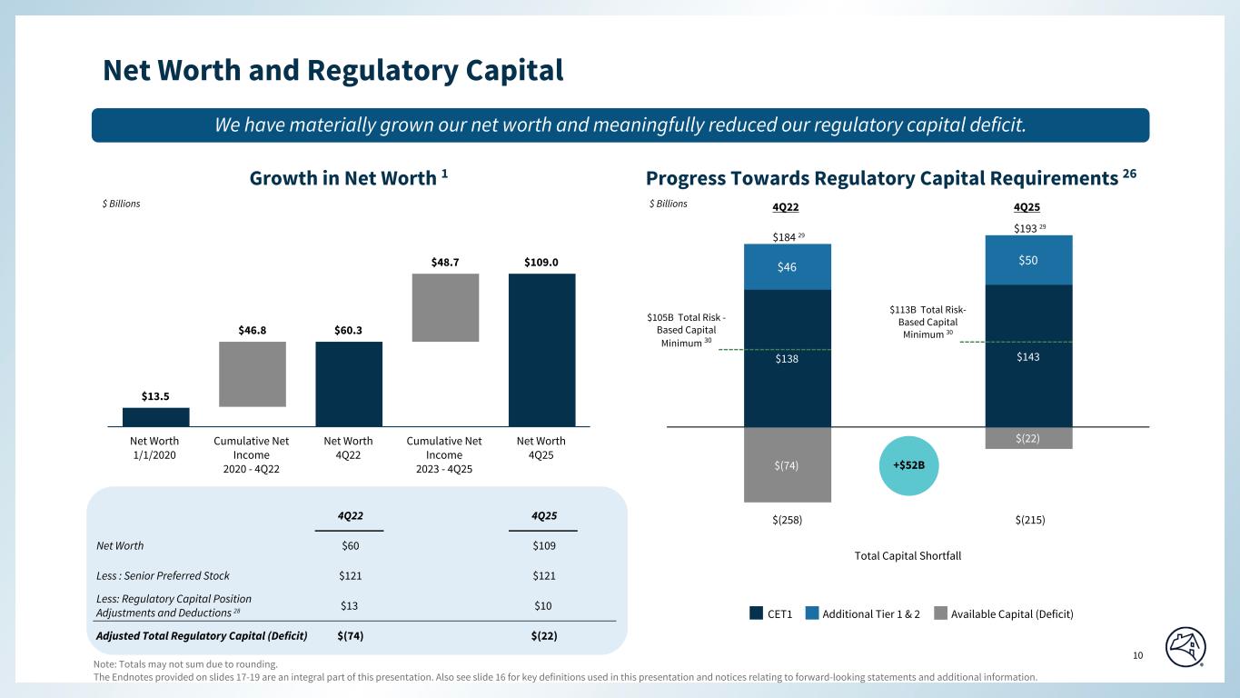 The Endnotes provided on slides 17-19 are an integral part of this presentation. Also see slide 16 for key definitions used in this presentation and notices relating to forward-looking statements and additional information. 10 Special Colors #edebe9 #898989 #cff2f2 Categorical Color Palette #05314d #1c6fa3 #898989 #4d4d4d #5dc7d0 #c55422 #2c6937 For callout boxes Use in rounded shape Sequential Color Palette #121212 #05314d #085280 #1c6fa3 #509ed5 #98c6e6 Line graph Color Palette #c44786 (refrain from using) #085280 #5dc7d0 #898989 #e66e39 #418152 #ffb400 $138 $143 $46 $50 $(74) $(22) 4Q22 4Q25 Net Worth $60 $109 Less : Senior Preferred Stock $121 $121 Less: Regulatory Capital Position Adjustments and Deductions 28 $13 $10 Adjusted Total Regulatory Capital (Deficit) $(74) $(22) Net Worth and Regulatory Capital Growth in Net Worth 1 $13.5 $46.8 $60.3 $48.7 $109.0 Net Worth 1/1/2020 Cumulative Net Income 2020 - 4Q22 Net Worth 4Q22 Cumulative Net Income 2023 - 4Q25 Net Worth 4Q25 $ Billions $ Billions Progress Towards Regulatory Capital Requirements 26 CET1 Additional Tier 1 & 2 $105B Total Risk - Based Capital Minimum 30 $113B Total Risk- Based Capital Minimum 30 We have materially grown our net worth and meaningfully reduced our regulatory capital deficit. Available Capital (Deficit) 4Q22 4Q25 $(258) $(215) Total Capital Shortfall $184 29 $193 29 Note: Totals may not sum due to rounding. +$52B Page align