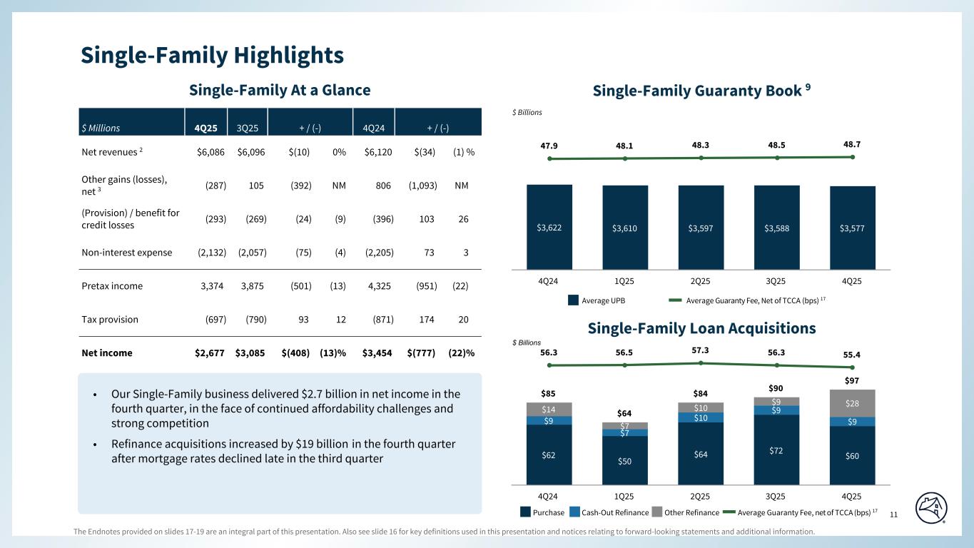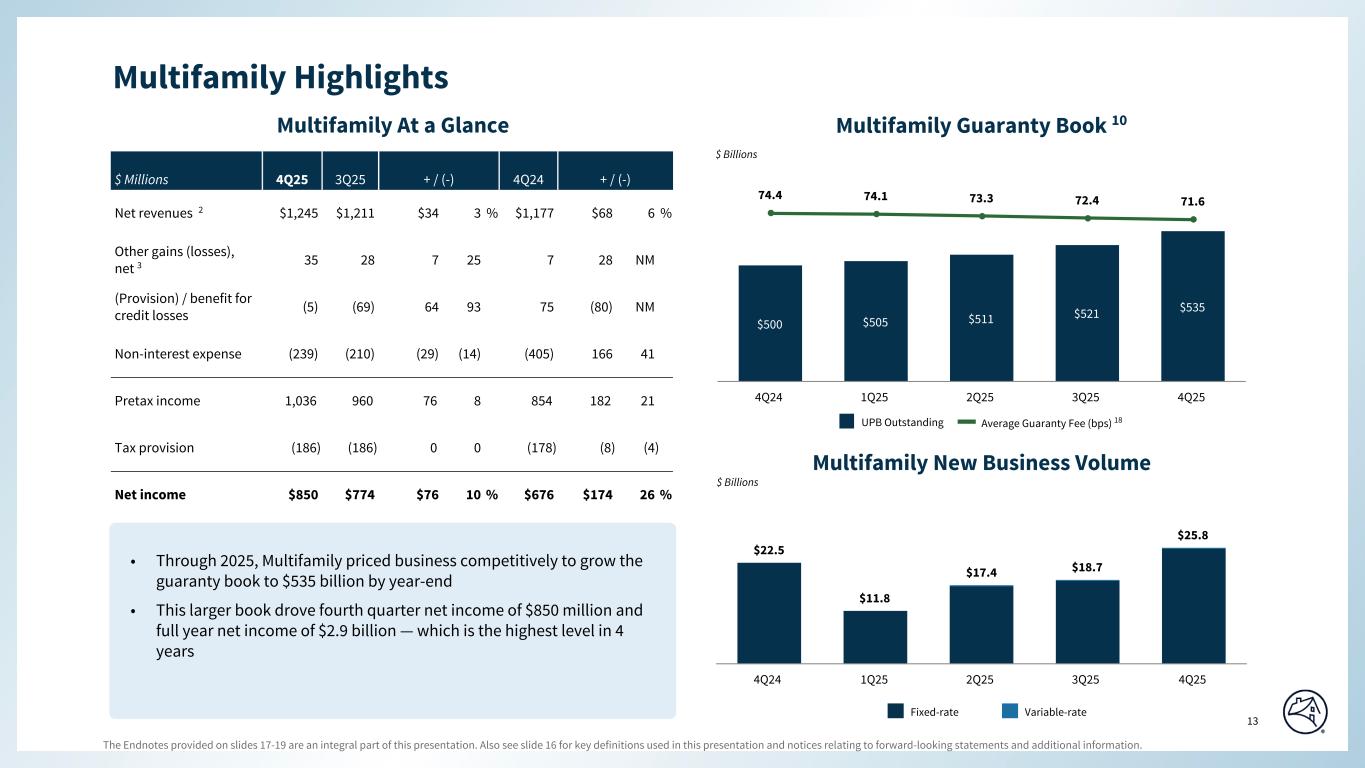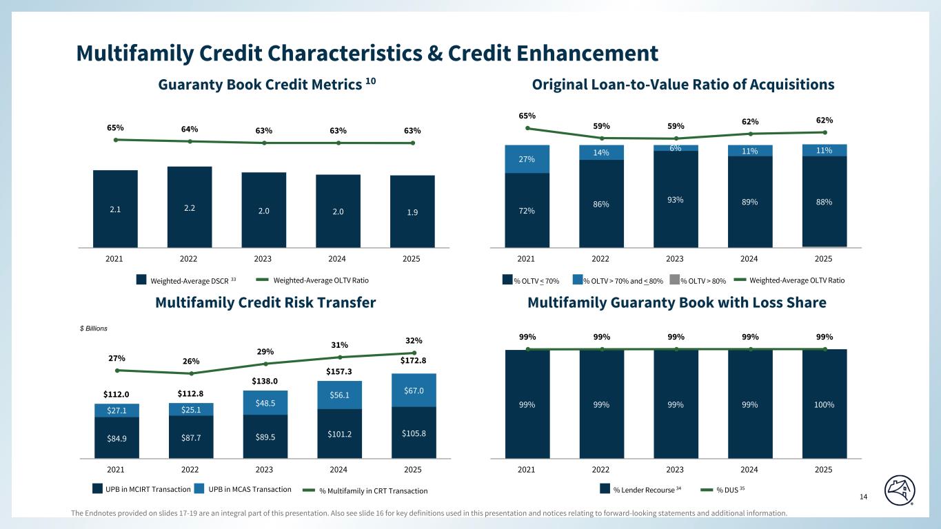 The Endnotes provided on slides 17-19 are an integral part of this presentation. Also see slide 16 for key definitions used in this presentation and notices relating to forward-looking statements and additional information. 13 Special Colors #edebe9 #898989 #cff2f2 Categorical Color Palette #05314d #1c6fa3 #898989 #4d4d4d #5dc7d0 #c55422 #2c6937 For callout boxes Use in rounded shape Sequential Color Palette #121212 #05314d #085280 #1c6fa3 #509ed5 #98c6e6 Line graph Color Palette #c44786 (refrain from using) #085280 #5dc7d0 #898989 #e66e39 #418152 #ffb400 $500 $505 $511 $521 $535 74.4 74.1 73.3 72.4 71.6 4Q24 1Q25 2Q25 3Q25 4Q25 Multifamily At a Glance Multifamily Guaranty Book 10 $ Millions 4Q25 3Q25 + / (-) 4Q24 + / (-) Net revenues 2 $1,245 $1,211 $34 3 % $1,177 $68 6 % Other gains (losses), net 3 35 28 7 25 7 28 NM (Provision) / benefit for credit losses (5) (69) 64 93 75 (80) NM Non-interest expense (239) (210) (29) (14) (405) 166 41 Pretax income 1,036 960 76 8 854 182 21 Tax provision (186) (186) 0 0 (178) (8) (4) Net income $850 $774 $76 10 % $676 $174 26 % $22.5 $11.8 $17.4 $18.7 $25.8 4Q24 1Q25 2Q25 3Q25 4Q25 Fixed-rate Multifamily New Business Volume Variable-rate $ Billions $ Billions UPB Outstanding Average Guaranty Fee (bps) 18 Multifamily Highlights Page align • Through 2025, Multifamily priced business competitively to grow the guaranty book to $535 billion by year-end • This larger book drove fourth quarter net income of $850 million and full year net income of $2.9 billion — which is the highest level in 4 years