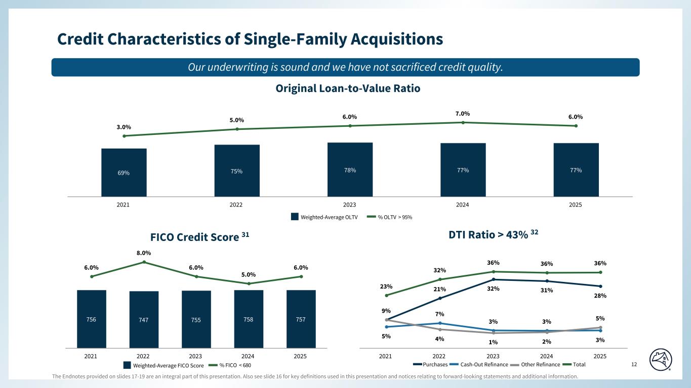 The Endnotes provided on slides 17-19 are an integral part of this presentation. Also see slide 16 for key definitions used in this presentation and notices relating to forward-looking statements and additional information. 11 Special Colors #edebe9 #898989 #cff2f2 Categorical Color Palette #05314d #1c6fa3 #898989 #4d4d4d #5dc7d0 #c55422 #2c6937 For callout boxes Use in rounded shape Sequential Color Palette #121212 #05314d #085280 #1c6fa3 #509ed5 #98c6e6 Line graph Color Palette #c44786 (refrain from using) #085280 #5dc7d0 #898989 #e66e39 #418152 #ffb400 $3,622 $3,610 $3,597 $3,588 $3,577 47.9 48.1 48.3 48.5 48.7 4Q24 1Q25 2Q25 3Q25 4Q25 $62 $50 $64 $72 $60 $9 $7 $10 $9 $9 $14 $7 $10 $9 $28 $85 $64 $84 $90 $97 56.3 56.5 57.3 56.3 55.4 4Q24 1Q25 2Q25 3Q25 4Q25 $ Billions Single-Family At a Glance Purchase Average Guaranty Fee, net of TCCA (bps) 17Cash-Out Refinance Other Refinance Average UPB Average Guaranty Fee, Net of TCCA (bps) 17 Single-Family Guaranty Book 9 Single-Family Loan Acquisitions $ Billions $ Millions 4Q25 3Q25 + / (-) 4Q24 + / (-) Net revenues 2 $6,086 $6,096 $(10) 0 % $6,120 $(34) (1) % Other gains (losses), net 3 (287) 105 (392) NM 806 (1,093) NM (Provision) / benefit for credit losses (293) (269) (24) (9) (396) 103 26 Non-interest expense (2,132) (2,057) (75) (4) (2,205) 73 3 Pretax income 3,374 3,875 (501) (13) 4,325 (951) (22) Tax provision (697) (790) 93 12 (871) 174 20 Net income $2,677 $3,085 $(408) (13) % $3,454 $(777) (22) % Single-Family Highlights Page align • Our Single-Family business delivered $2.7 billion in net income in the fourth quarter, in the face of continued affordability challenges and strong competition • Refinance acquisitions increased by $19 billion in the fourth quarter after mortgage rates declined late in the third quarter