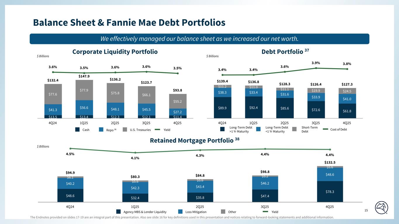 The Endnotes provided on slides 17-19 are an integral part of this presentation. Also see slide 16 for key definitions used in this presentation and notices relating to forward-looking statements and additional information. 15 Special Colors #edebe9 #898989 #cff2f2 Categorical Color Palette #05314d #1c6fa3 #898989 #4d4d4d #5dc7d0 #c55422 #2c6937 For callout boxes Use in rounded shape Sequential Color Palette #121212 #05314d #085280 #1c6fa3 #509ed5 #98c6e6 Line graph Color Palette #c44786 (refrain from using) #085280 #5dc7d0 #898989 #e66e39 #418152 #ffb400 $13.5 $13.4 $12.3 $12.1 $11.4 $41.3 $56.6 $48.1 $45.5 $27.2 $77.6 $77.9 $75.8 $66.1 $55.2 $132.4 $147.9 $136.2 $123.7 $93.8 3.6% 3.5% 3.6% 3.6% 3.5% 4Q24 1Q25 2Q25 3Q25 4Q25 $89.9 $92.4 $85.6 $72.6 $61.8 $38.3 $33.4 $31.6 $33.9 $41.0 $11.2 $11.0 $11.1 $19.9 $24.5 $139.4 $136.8 $128.3 $126.4 $127.3 3.4% 3.4% 3.6% 3.9% 3.8% 4Q24 1Q25 2Q25 3Q25 4Q25 Cash Repo 36 U.S. Treasuries Debt Portfolio 37 Long-Term Debt >1 Yr Maturity Long-Term Debt <1 Yr Maturity Short-Term Debt Corporate Liquidity Portfolio Cost of DebtYield $ Billions $ Billions $48.6 $32.4 $35.8 $47.4 $78.3 $40.2 $42.3 $43.4 $46.2 $48.6 $6.1 $5.6 $5.6 $5.2 $5.6 $94.9 $80.3 $84.8 $98.8 $132.5 4.5% 4.1% 4.3% 4.4% 4.4% 4Q24 1Q25 2Q25 3Q25 4Q25 $ Billions Agency MBS & Lender Liquidity Loss Mitigation Other Retained Mortgage Portfolio 38 Yield Balance Sheet & Fannie Mae Debt Portfolios Page align We effectively managed our balance sheet as we increased our net worth.