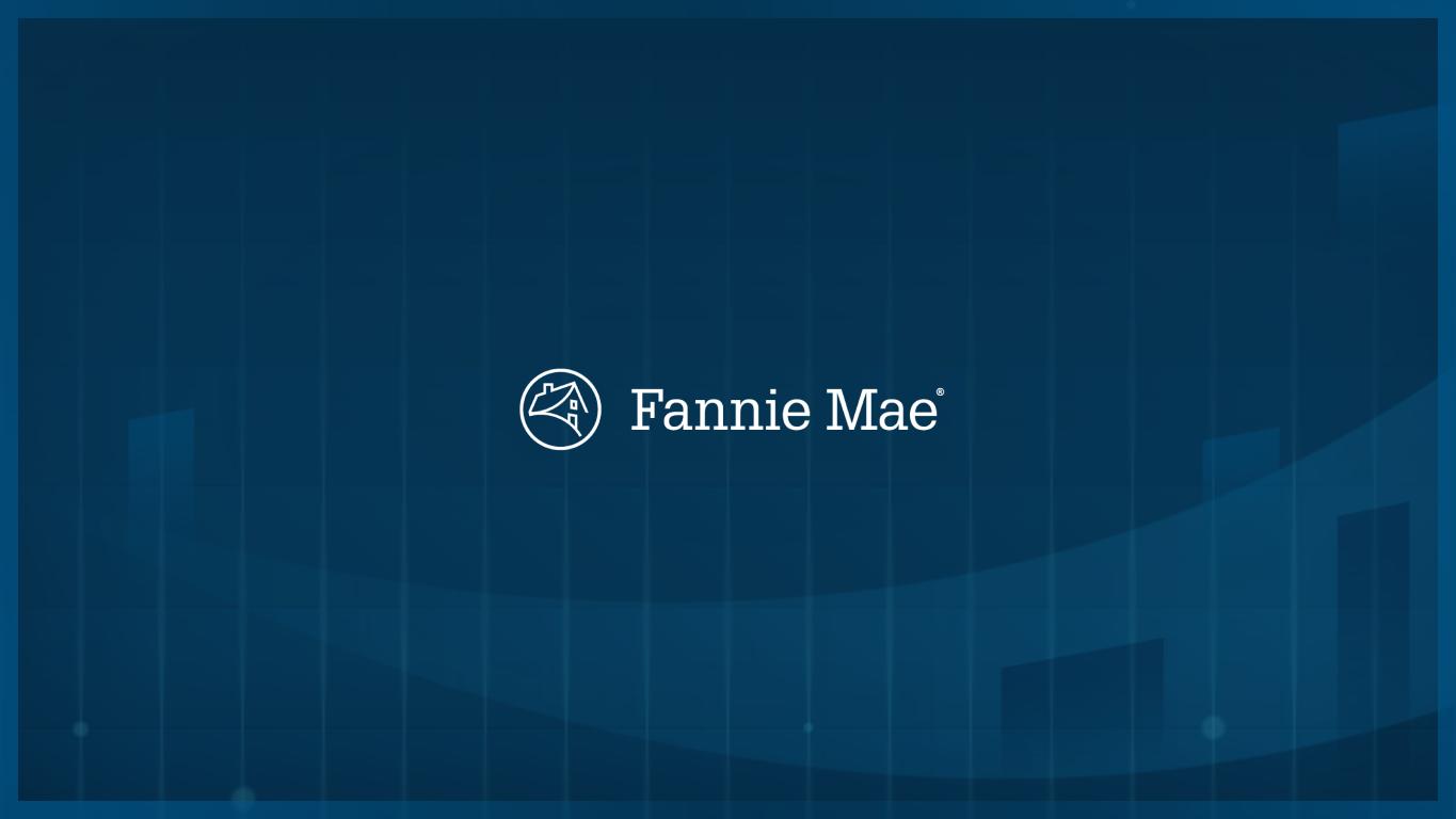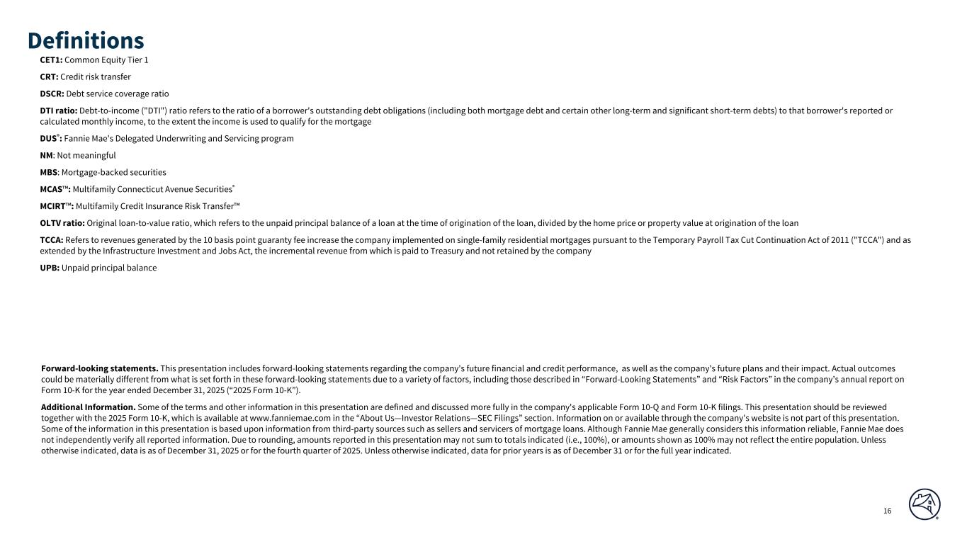 DRAFT 16 CET1: Common Equity Tier 1 CRT: Credit risk transfer DSCR: Debt service coverage ratio DTI ratio: Debt-to-income ("DTI") ratio refers to the ratio of a borrower's outstanding debt obligations (including both mortgage debt and certain other long-term and significant short-term debts) to that borrower's reported or calculated monthly income, to the extent the income is used to qualify for the mortgage DUS®: Fannie Mae's Delegated Underwriting and Servicing program NM: Not meaningful MBS: Mortgage-backed securities MCAS™: Multifamily Connecticut Avenue Securities® MCIRT™: Multifamily Credit Insurance Risk Transfer™ OLTV ratio: Original loan-to-value ratio, which refers to the unpaid principal balance of a loan at the time of origination of the loan, divided by the home price or property value at origination of the loan TCCA: Refers to revenues generated by the 10 basis point guaranty fee increase the company implemented on single-family residential mortgages pursuant to the Temporary Payroll Tax Cut Continuation Act of 2011 ("TCCA") and as extended by the Infrastructure Investment and Jobs Act, the incremental revenue from which is paid to Treasury and not retained by the company UPB: Unpaid principal balance Definitions Forward-looking statements. This presentation includes forward-looking statements regarding the company's future financial and credit performance, as well as the company's future plans and their impact. Actual outcomes could be materially different from what is set forth in these forward-looking statements due to a variety of factors, including those described in “Forward-Looking Statements” and “Risk Factors” in the company’s annual report on Form 10-K for the year ended December 31, 2025 (“2025 Form 10-K”). Additional Information. Some of the terms and other information in this presentation are defined and discussed more fully in the company's applicable Form 10-Q and Form 10-K filings. This presentation should be reviewed together with the 2025 Form 10-K, which is available at www.fanniemae.com in the “About Us—Investor Relations—SEC Filings” section. Information on or available through the company's website is not part of this presentation. Some of the information in this presentation is based upon information from third-party sources such as sellers and servicers of mortgage loans. Although Fannie Mae generally considers this information reliable, Fannie Mae does not independently verify all reported information. Due to rounding, amounts reported in this presentation may not sum to totals indicated (i.e., 100%), or amounts shown as 100% may not reflect the entire population. Unless otherwise indicated, data is as of December 31, 2025 or for the fourth quarter of 2025. Unless otherwise indicated, data for prior years is as of December 31 or for the full year indicated.