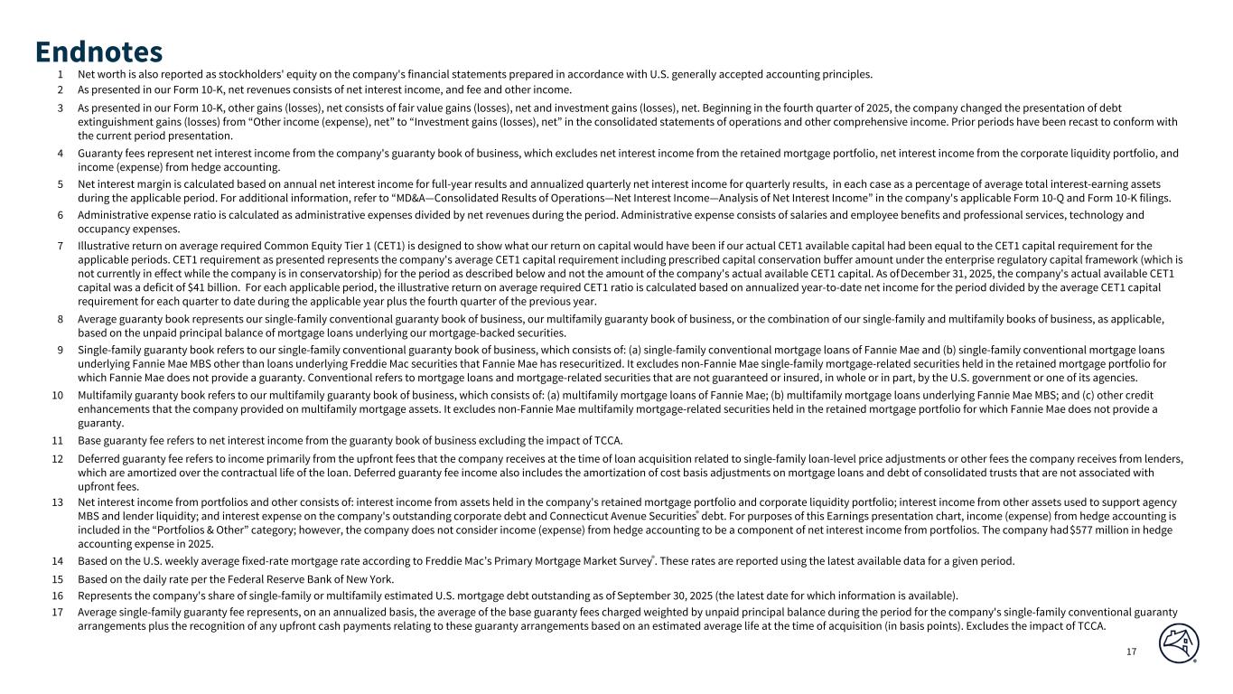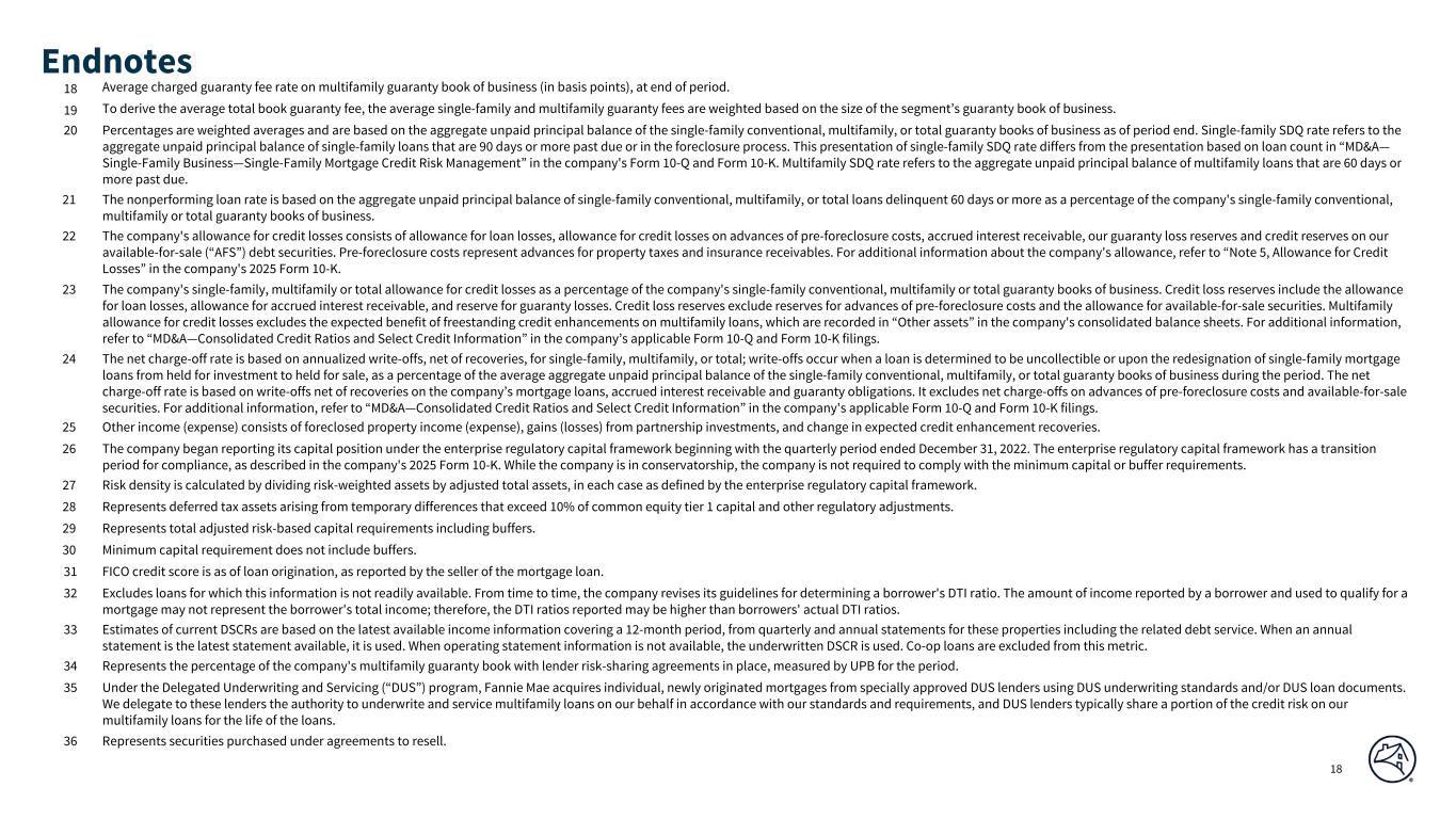 DRAFT 17 1 Net worth is also reported as stockholders' equity on the company's financial statements prepared in accordance with U.S. generally accepted accounting principles. 2 As presented in our Form 10-K, net revenues consists of net interest income, and fee and other income. 3 As presented in our Form 10-K, other gains (losses), net consists of fair value gains (losses), net and investment gains (losses), net. Beginning in the fourth quarter of 2025, the company changed the presentation of debt extinguishment gains (losses) from “Other income (expense), net” to “Investment gains (losses), net” in the consolidated statements of operations and other comprehensive income. Prior periods have been recast to conform with the current period presentation. 4 Guaranty fees represent net interest income from the company's guaranty book of business, which excludes net interest income from the retained mortgage portfolio, net interest income from the corporate liquidity portfolio, and income (expense) from hedge accounting. 5 Net interest margin is calculated based on annual net interest income for full-year results and annualized quarterly net interest income for quarterly results, in each case as a percentage of average total interest-earning assets during the applicable period. For additional information, refer to “MD&A—Consolidated Results of Operations—Net Interest Income—Analysis of Net Interest Income” in the company's applicable Form 10-Q and Form 10-K filings. 6 Administrative expense ratio is calculated as administrative expenses divided by net revenues during the period. Administrative expense consists of salaries and employee benefits and professional services, technology and occupancy expenses. 7 Illustrative return on average required Common Equity Tier 1 (CET1) is designed to show what our return on capital would have been if our actual CET1 available capital had been equal to the CET1 capital requirement for the applicable periods. CET1 requirement as presented represents the company's average CET1 capital requirement including prescribed capital conservation buffer amount under the enterprise regulatory capital framework (which is not currently in effect while the company is in conservatorship) for the period as described below and not the amount of the company's actual available CET1 capital. As of December 31, 2025, the company's actual available CET1 capital was a deficit of $41 billion. For each applicable period, the illustrative return on average required CET1 ratio is calculated based on annualized year-to-date net income for the period divided by the average CET1 capital requirement for each quarter to date during the applicable year plus the fourth quarter of the previous year. 8 Average guaranty book represents our single-family conventional guaranty book of business, our multifamily guaranty book of business, or the combination of our single-family and multifamily books of business, as applicable, based on the unpaid principal balance of mortgage loans underlying our mortgage-backed securities. 9 Single-family guaranty book refers to our single-family conventional guaranty book of business, which consists of: (a) single-family conventional mortgage loans of Fannie Mae and (b) single-family conventional mortgage loans underlying Fannie Mae MBS other than loans underlying Freddie Mac securities that Fannie Mae has resecuritized. It excludes non-Fannie Mae single-family mortgage-related securities held in the retained mortgage portfolio for which Fannie Mae does not provide a guaranty. Conventional refers to mortgage loans and mortgage-related securities that are not guaranteed or insured, in whole or in part, by the U.S. government or one of its agencies. 10 Multifamily guaranty book refers to our multifamily guaranty book of business, which consists of: (a) multifamily mortgage loans of Fannie Mae; (b) multifamily mortgage loans underlying Fannie Mae MBS; and (c) other credit enhancements that the company provided on multifamily mortgage assets. It excludes non-Fannie Mae multifamily mortgage-related securities held in the retained mortgage portfolio for which Fannie Mae does not provide a guaranty. 11 Base guaranty fee refers to net interest income from the guaranty book of business excluding the impact of TCCA. 12 Deferred guaranty fee refers to income primarily from the upfront fees that the company receives at the time of loan acquisition related to single-family loan-level price adjustments or other fees the company receives from lenders, which are amortized over the contractual life of the loan. Deferred guaranty fee income also includes the amortization of cost basis adjustments on mortgage loans and debt of consolidated trusts that are not associated with upfront fees. 13 Net interest income from portfolios and other consists of: interest income from assets held in the company's retained mortgage portfolio and corporate liquidity portfolio; interest income from other assets used to support agency MBS and lender liquidity; and interest expense on the company's outstanding corporate debt and Connecticut Avenue Securities® debt. For purposes of this Earnings presentation chart, income (expense) from hedge accounting is included in the “Portfolios & Other” category; however, the company does not consider income (expense) from hedge accounting to be a component of net interest income from portfolios. The company had $577 million in hedge accounting expense in 2025. 14 Based on the U.S. weekly average fixed-rate mortgage rate according to Freddie Mac’s Primary Mortgage Market Survey®. These rates are reported using the latest available data for a given period. 15 Based on the daily rate per the Federal Reserve Bank of New York. 16 Represents the company's share of single-family or multifamily estimated U.S. mortgage debt outstanding as of September 30, 2025 (the latest date for which information is available). 17 Average single-family guarant