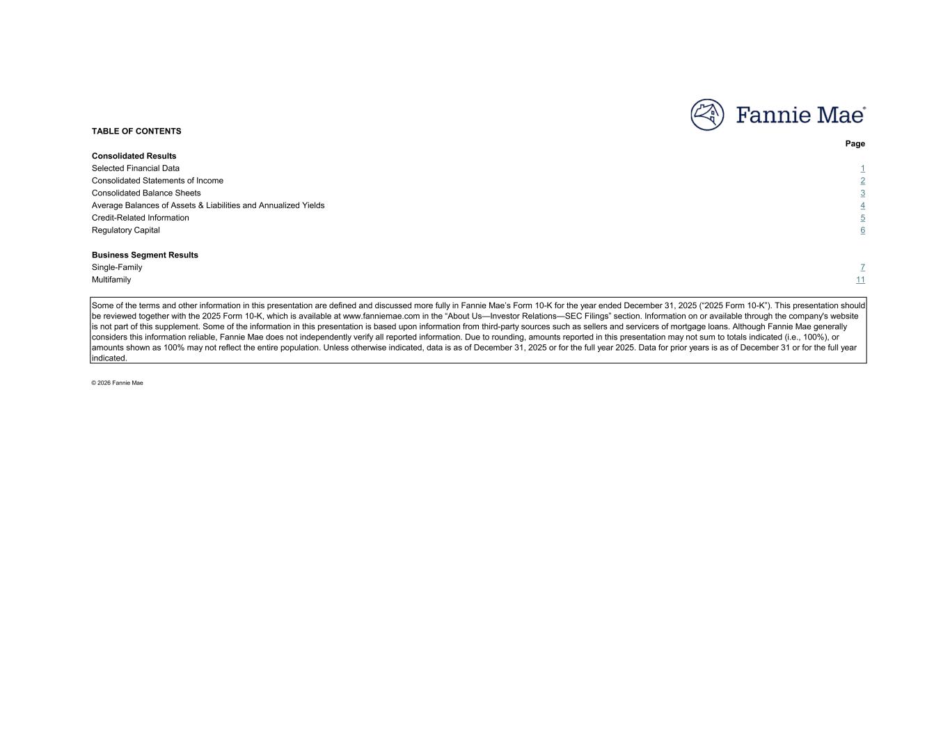 TABLE OF CONTENTS Page Consolidated Results Selected Financial Data 1 Consolidated Statements of Income 2 Consolidated Balance Sheets 3 Average Balances of Assets & Liabilities and Annualized Yields 4 Credit-Related Information 5 Regulatory Capital 6 Business Segment Results Single-Family 7 Multifamily 11 © 2026 Fannie Mae Some of the terms and other information in this presentation are defined and discussed more fully in Fannie Mae’s Form 10-K for the year ended December 31, 2025 (“2025 Form 10-K”). This presentation should be reviewed together with the 2025 Form 10-K, which is available at www.fanniemae.com in the “About Us—Investor Relations—SEC Filings” section. Information on or available through the company's website is not part of this supplement. Some of the information in this presentation is based upon information from third-party sources such as sellers and servicers of mortgage loans. Although Fannie Mae generally considers this information reliable, Fannie Mae does not independently verify all reported information. Due to rounding, amounts reported in this presentation may not sum to totals indicated (i.e., 100%), or amounts shown as 100% may not reflect the entire population. Unless otherwise indicated, data is as of December 31, 2025 or for the full year 2025. Data for prior years is as of December 31 or for the full year indicated.