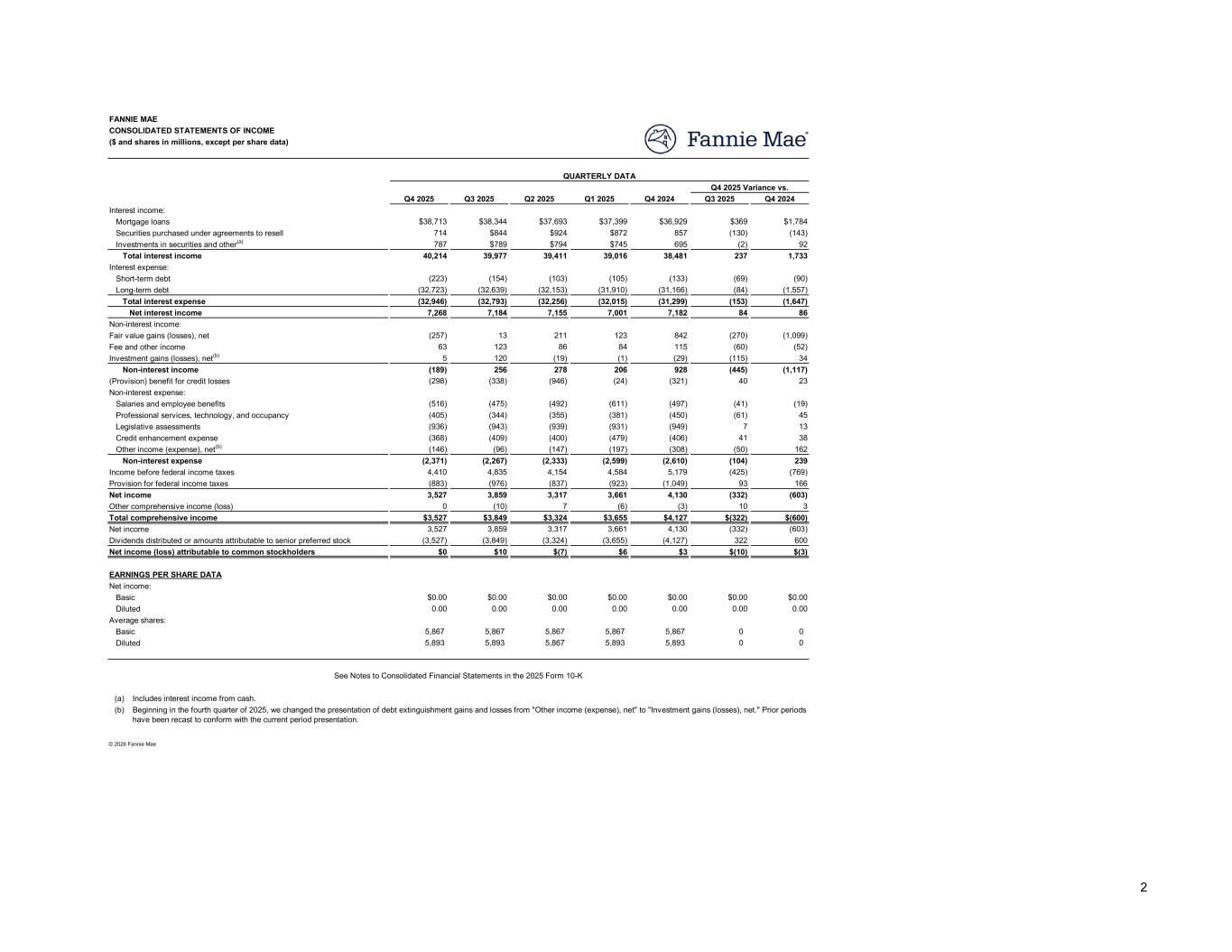 Q4 2025 Q3 2025 Q2 2025 Q1 2025 Q4 2024 Q3 2025 Q4 2024 $38,713 $38,344 $37,693 $37,399 $36,929 $369 $1,784 714 $844 $924 $872 857 (130) (143) 787 $789 $794 $745 695 (2) 92 40,214 39,977 39,411 39,016 38,481 237 1,733 (223) (154) (103) (105) (133) (69) (90) (32,723) (32,639) (32,153) (31,910) (31,166) (84) (1,557) (32,946) (32,793) (32,256) (32,015) (31,299) (153) (1,647) 7,268 7,184 7,155 7,001 7,182 84 86 (257) 13 211 123 842 (270) (1,099) 63 123 86 84 115 (60) (52) 5 120 (19) (1) (29) (115) 34 (189) 256 278 206 928 (445) (1,117) (298) (338) (946) (24) (321) 40 23 (516) (475) (492) (611) (497) (41) (19) (405) (344) (355) (381) (450) (61) 45 (936) (943) (939) (931) (949) 7 13 (368) (409) (400) (479) (406) 41 38 (146) (96) (147) (197) (308) (50) 162 (2,371) (2,267) (2,333) (2,599) (2,610) (104) 239 4,410 4,835 4,154 4,584 5,179 (425) (769) (883) (976) (837) (923) (1,049) 93 166 3,527 3,859 3,317 3,661 4,130 (332) (603) 0 (10) 7 (6) (3) 10 3 $3,527 $3,849 $3,324 $3,655 $4,127 $(322) $(600) 3,527 3,859 3,317 3,661 4,130 (332) (603) (3,527) (3,849) (3,324) (3,655) (4,127) 322 600 $0 $10 $(7) $6 $3 $(10) $(3) $0.00 $0.00 $0.00 $0.00 $0.00 $0.00 $0.00 0.00 0.00 0.00 0.00 0.00 0.00 0.00 5,867 5,867 5,867 5,867 5,867 0 0 5,893 5,893 5,867 5,893 5,893 0 0 (a) (b) CONSOLIDATED STATEMENTS OF INCOME FANNIE MAE ($ and shares in millions, except per share data) Q4 2025 Variance vs. QUARTERLY DATA Mortgage loans Interest income: Securities purchased under agreements to resell Investments in securities and other(a) Interest expense: Total interest income Long-term debt Short-term debt Total interest expense Net interest income Fee and other income Fair value gains (losses), net Non-interest income: Investment gains (losses), net(b) Non-interest income Salaries and employee benefits (Provision) benefit for credit losses Non-interest expense: Legislative assessments Professional services, technology, and occupancy Credit enhancement expense Other income (expense), net(b) Income before federal income taxes Non-interest expense Net income Provision for federal income taxes Other comprehensive income (loss) Total comprehensive income Dividends distributed or amounts attributable to senior preferred stock Net income Net income (loss) attributable to common stockholders EARNINGS PER SHARE DATA Net income: Diluted Basic Basic Average shares: Diluted © 2026 Fannie Mae See Notes to Consolidated Financial Statements in the 2025 Form 10-K Includes interest income from cash. Beginning in the fourth quarter of 2025, we changed the presentation of debt extinguishment gains and losses from "Other income (expense), net" to "Investment gains (losses), net." Prior periods have been recast to conform with the current period presentation. 2