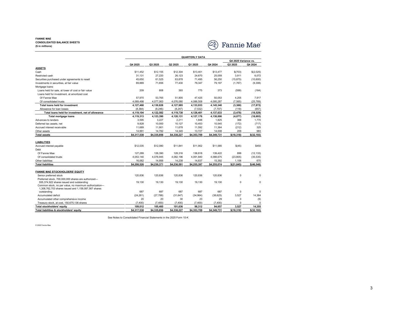Q4 2025 Q3 2025 Q2 2025 Q1 2025 Q4 2024 Q3 2025 Q4 2024 $11,452 $12,155 $12,304 $13,401 $13,477 $(703) $(2,025) 31,131 27,220 26,123 24,670 25,059 3,911 6,072 45,650 61,525 63,878 71,495 56,250 (15,875) (10,600) 69,889 71,656 77,430 79,347 79,197 (1,767) (9,308) 209 808 393 775 373 (599) (164) 57,970 53,765 51,905 47,425 50,053 4,205 7,917 4,069,498 4,077,063 4,076,080 4,086,508 4,095,287 (7,565) (25,789) 4,127,468 4,130,828 4,127,985 4,133,933 4,145,340 (3,360) (17,872) (8,364) (8,246) (8,247) (7,532) (7,707) (118) (657) 4,119,104 4,122,582 4,119,738 4,126,401 4,137,633 (3,478) (18,529) 4,119,313 4,123,390 4,120,131 4,127,176 4,138,006 (4,077) (18,693) 3,595 3,227 2,211 1,848 1,825 368 1,770 9,828 10,000 10,127 10,453 10,545 (172) (717) 11,689 11,901 11,678 11,592 11,364 (212) 325 14,991 14,782 14,345 13,727 14,008 209 983 Total assets $4,317,538 $4,335,856 $4,338,227 $4,353,709 $4,349,731 $(18,318) $(32,193) $12,035 $12,080 $11,841 $11,902 $11,585 $(45) $450 127,289 126,390 128,316 136,818 139,422 899 (12,133) 4,053,140 4,076,945 4,082,196 4,091,840 4,088,675 (23,805) (35,535) 16,062 14,956 14,238 14,837 15,392 1,106 670 Total liabilities $4,208,526 $4,230,371 $4,236,591 $4,255,397 $4,255,074 $(21,845) $(46,548) 120,836 120,836 120,836 120,836 120,836 0 0 19,130 19,130 19,130 19,130 19,130 0 0 687 687 687 687 687 0 0 (24,261) (27,788) (31,647) (34,964) (38,625) 3,527 14,364 20 20 30 23 29 0 (9) (7,400) (7,400) (7,400) (7,400) (7,400) 0 0 Total stockholders' equity 109,012 105,485 101,636 98,312 94,657 3,527 14,355 Total liabilities & stockholders' equity $4,317,538 $4,335,856 $4,338,227 $4,353,709 $4,349,731 $(18,318) $(32,193) CONSOLIDATED BALANCE SHEETS FANNIE MAE ($ in millions) Q4 2025 Variance vs. QUARTERLY DATA Cash ASSETS Restricted cash Securities purchased under agreements to resell Mortgage loans: Investments in securities, at fair value Loans held for investment, at amortized cost Loans held for sale, at lower of cost or fair value Of Fannie Mae Of consolidated trusts Allowance for loan losses Total loans held for investment Total loans held for investment, net of allowance Advances to lenders Deferred tax assets, net Other assets Accrued interest receivable LIABILITIES Accrued interest payable Of Fannie Mae Debt Total mortgage loans © 2026 Fannie Mae See Notes to Consolidated Financial Statements in the 2025 Form 10-K Other liabilities Of consolidated trusts Senior preferred stock FANNIE MAE STOCKHOLDERS' EQUITY Common stock, no par value, no maximum authorization— 1,308,762,703 shares issued and 1,158,087,567 shares outstanding Preferred stock, 700,000,000 shares are authorized— 555,374,922 shares issued and outstanding Accumulated deficit Accumulated other comprehensive income Treasury stock, at cost, 150,675,136 shares 3