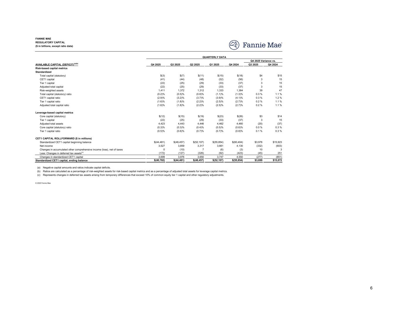 Q4 2025 Q3 2025 Q2 2025 Q1 2025 Q4 2024 Q3 2025 Q4 2024 $(3) $(7) $(11) $(15) $(18) $4 $15 (41) (44) (48) (52) (56) 3 15 (22) (25) (29) (33) (37) 3 15 (22) (25) (29) (33) (37) 3 15 1,411 1,372 1,312 1,333 1,364 39 47 (0.2)% (0.5)% (0.8)% (1.1)% (1.3)% 0.3 % 1.1 % (2.9)% (3.2)% (3.7)% (3.9)% (4.1)% 0.3 % 1.2 % (1.6)% (1.8)% (2.2)% (2.5)% (2.7)% 0.2 % 1.1 % (1.6)% (1.8)% (2.2)% (2.5)% (2.7)% 0.2 % 1.1 % $(12) $(15) $(19) $(23) $(26) $3 $14 (22) (25) (29) (33) (37) 3 15 4,423 4,443 4,446 4,462 4,460 (20) (37) (0.3)% (0.3)% (0.4)% (0.5)% (0.6)% 0.0 % 0.3 % (0.5)% (0.6)% (0.7)% (0.7)% (0.8)% 0.1 % 0.3 % $(44,481) $(48,457) $(52,107) $(55,854) $(60,404) $3,976 $15,923 3,527 3,859 3,317 3,661 4,130 (332) (603) 0 (10) 7 (6) (3) 10 3 (172) (127) (326) (92) (423) (45) 251 3,699 3,976 3,650 3,747 4,550 (277) (851) Standardized CET1 capital, ending balance $(40,782) $(44,481) $(48,457) $(52,107) $(55,854) $3,699 $15,072 (a) (b) (c) REGULATORY CAPITAL FANNIE MAE ($ in billions, except ratio data) AVAILABLE CAPITAL (DEFICIT)(a)(b) Q4 2025 Variance vs. QUARTERLY DATA Standardized Risk-based capital metrics Total capital (statutory) CET1 capital Adjusted total capital Tier 1 capital Total capital (statutory) ratio Risk-weighted assets CET1 capital ratio Tier 1 capital ratio Adjusted total capital ratio Core capital (statutory) Leverage-based capital metrics Tier 1 capital Adjusted total assets Tier 1 capital ratio Core capital (statutory) ratio CET1 CAPITAL ROLLFORWARD ($ in millions) Standardized CET1 capital beginning balance Net income Less: Changes in deferred tax assets(c) Changes in accumulated other comprehensive income (loss), net of taxes © 2026 Fannie Mae Negative capital amounts and ratios indicate capital deficits. Represents changes in deferred tax assets arising from temporary differences that exceed 10% of common equity tier 1 capital and other regulatory adjustments. Ratios are calculated as a percentage of risk-weighted assets for risk-based capital metrics and as a percentage of adjusted total assets for leverage capital metrics. Changes in standardized CET1 capital 6
