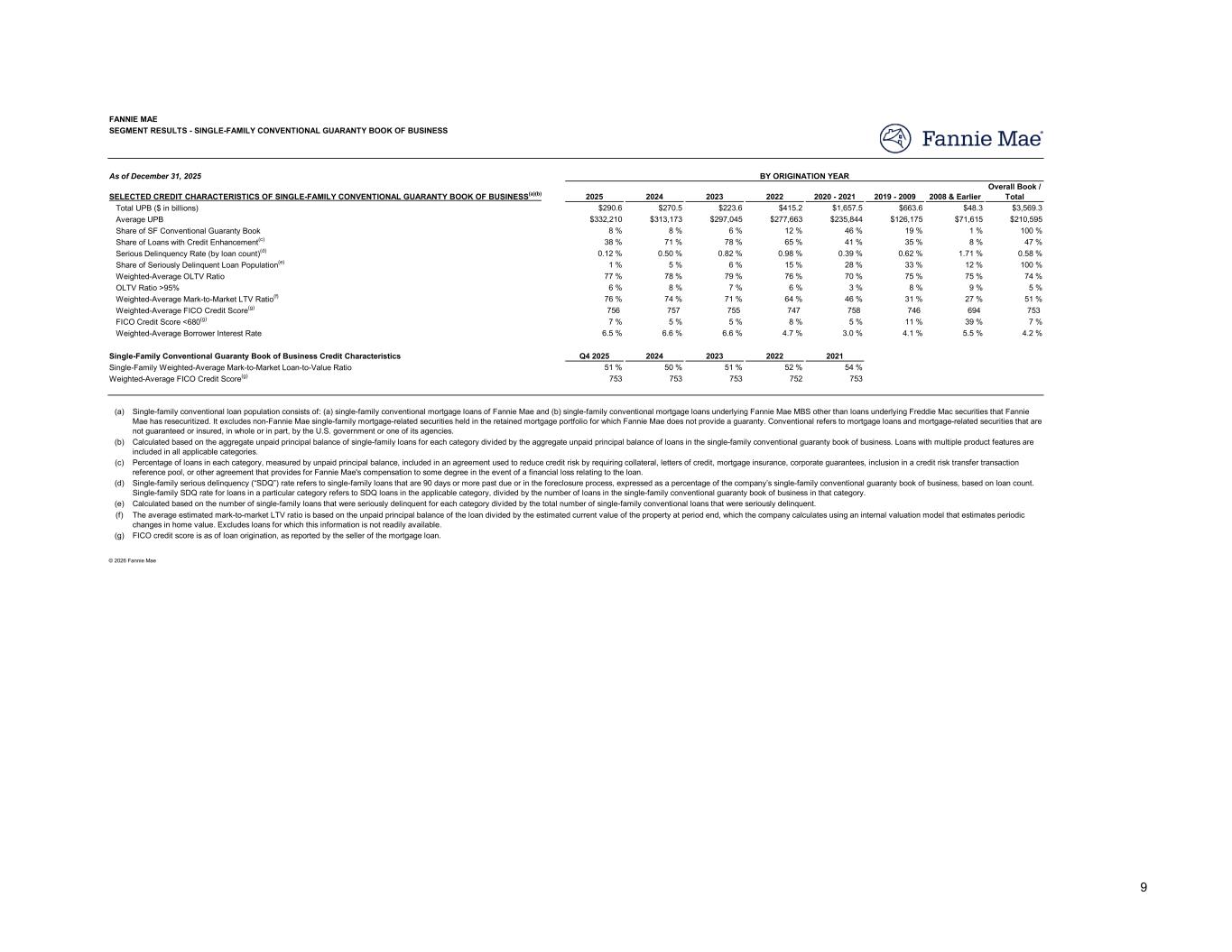 Q4 2025 Q3 2025 Q2 2025 Q1 2025 Q4 2024 Q3 2025 Q4 2024 $60 $72 $64 $50 $62 $(12) $(2) 37 18 20 14 23 19 14 $97 $90 $84 $64 $85 $7 $12 76 % 77 % 77 % 77 % 76 % 6 % 7 % 6 % 6 % 6 % 759 756 757 757 758 6 % 7 % 7 % 6 % 5 % 34 % 38 % 37 % 38 % 35 % 96 % 98 % 98 % 99 % 100 % 95 % 95 % 94 % 94 % 94 % 4 % 7 % 6 % 6 % 6 % Q4 2025 Q3 2025 Q2 2025 Q1 2025 Q4 2024 62 % 80 % 76 % 78 % 74 % 10 % 10 % 12 % 12 % 10 % 28 % 10 % 12 % 10 % 16 % (a) (b) (c) (d) SEGMENT RESULTS - SINGLE-FAMILY CONVENTIONAL LOAN ACQUISITIONS FANNIE MAE ($ in billions) SELECTED SINGLE-FAMILY CONVENTIONAL LOAN ACQUISITION DATA(a) Q4 2025 Variance vs. QUARTERLY DATA Purchase Conventional Loan Acquisition by Purpose: Refinance Total Conventional Loan Acquisitions Conventional Loan Credit Characteristics (by acquisition period): Original LTV Ratio >95% Weighted Average Original Loan-to-Value (“LTV”) Ratio Weighted-Average FICO Credit Score(b) FICO Credit Score <680(b) Fixed-rate Debt-to-Income (“DTI”) Ratio >43%(c) HomeReady(d) Primary Residence Excludes loans for which this information is not readily available. From time to time, the company revises its guidelines for determining a borrower's DTI ratio. The amount of income reported by a borrower and used to qualify for a mortgage may not represent the borrower's total income; therefore, the DTI ratios reported may be higher than borrowers' actual DTI ratios. FICO credit score is as of loan origination, as reported by the seller of the mortgage loan. Refers to HomeReady® mortgage loans, a low down payment mortgage product offered by the company that is designed for creditworthy low-income borrowers. HomeReady allows up to 97% loan-to-value ratio financing for home purchases. The company offers additional low down payment mortgage products that are not HomeReady loans; therefore, this category is not representative of all high LTV ratio single-family loans acquired or in the single-family conventional guaranty book of business for the periods shown. See the “Original LTV Ratio > 95%” category for information on the single-family loans acquired or in the single- family conventional guaranty book of business with original LTV ratios greater than 95%. © 2026 Fannie Mae ACQUISITION BY LOAN PURPOSE Cash-out refinance Purchase Other refinance Single-family conventional loan population consists of: (a) single-family conventional mortgage loans of Fannie Mae and (b) single-family conventional mortgage loans underlying Fannie Mae MBS other than loans underlying Freddie Mac securities that Fannie Mae has resecuritized. It excludes non-Fannie Mae single-family mortgage-related securities held in the retained mortgage portfolio for which Fannie Mae does not provide a guaranty. Conventional refers to mortgage loans and mortgage-related securities that are not guaranteed or insured, in whole or in part, by the U.S. government or one of its agencies. 8