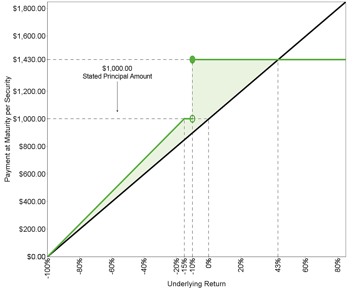 In this scenario, the underlying has depreciated from the initial underlying value to the final underlying value by more than the buffer percentage. As a result, your total return at maturity in this scenario would be negative and would reflect a loss of more than 1% of the stated principal amount of your securities (at a rate equal to the buffer rate) for every 1% by which the underlying declined beyond the buffer percentage.