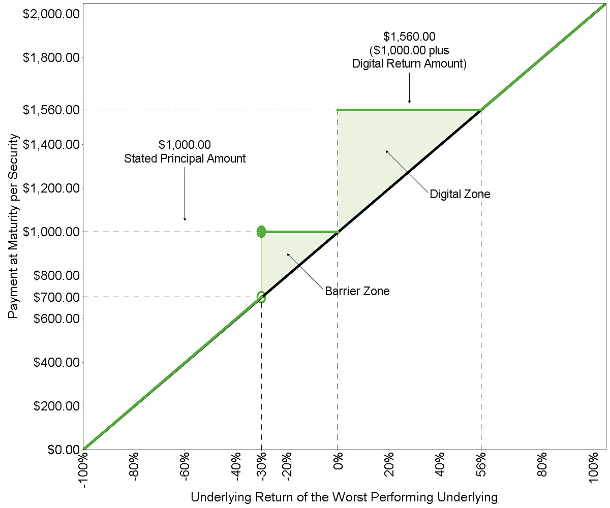 $560.00 per security (representing a digital return equal to 56.00% of the stated principal amount). You will receive the digital return amount only if the final underlying value of the worst performing underlying is greater than or equal to its initial underlying value. |