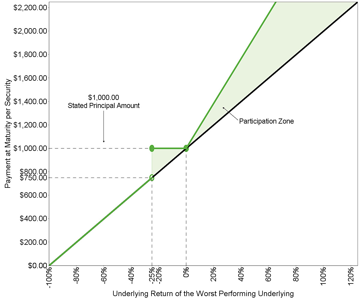 The diagram below illustrates your payment at maturity of the securities, assuming the securities have not previously been automatically redeemed, for a range of hypothetical underlying returns of the worst performing underlying. Your payment at maturity (if the securities are not earlier automatically redeemed) will be determined based solely on the performance of the worst performing underlying on the final valuation date.