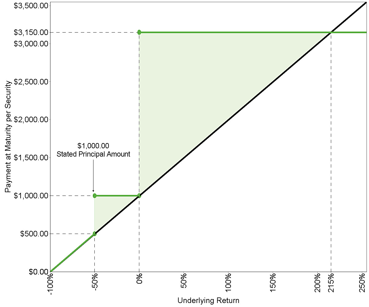If the securities are not automatically redeemed prior to maturity, you will receive at maturity for each security you then hold: ■If the final underlying value is greater than or equal to the initial underlying value: $1,000 + the premium applicable to the final valuation date ■If the final underlying value is less than the initial underlying value but greater than or equal to the final barrier value: $1,000 ■If the final underlying value is less than the final barrier value: $1,000 + ($1,000 × the underlying return) If the securities are not automatically redeemed prior to maturity and the final underlying value is less than the final barrier value, you will receive significantly less than the stated principal amount of your securities, and possibly nothing, at maturity. |