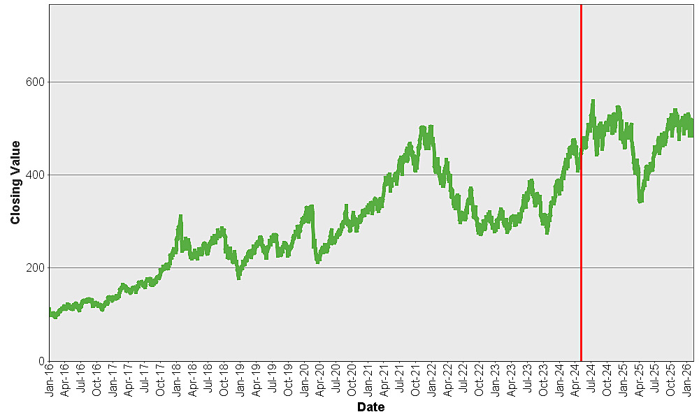 The following graph sets forth a comparison of the historical performance of the S&P 500 Futures Excess Return Index against the historical performance of the S&P 500® Index from January 4, 2016 through February 10, 2026, each normalized to have a closing value of 100.00 on January 4, 2016 to facilitate a comparison. The performance of the S&P 500® Index shown below is its price return performance – i.e., its performance without reflecting dividends. The total return performance of the S&P 500® Index (i.e., its performance reflecting dividends) would be greater than the price return performance shown below.
