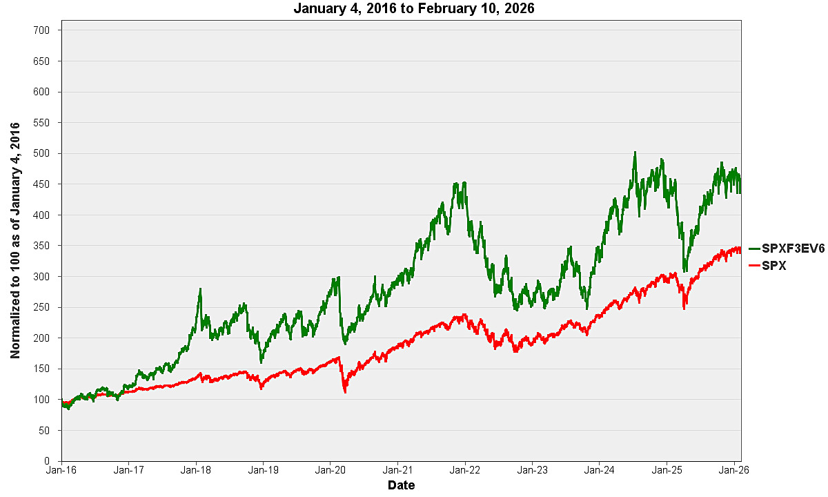 The following graphs set forth a comparison of the hypothetical back-tested and historical performance of the S&P 500 Futures 35% Edge Volatility 6% Decrement Index (USD) ER against the historical performance of the S&P 500® Index. The first graph shows comparative performance data for the period from January 4, 2016 through February 10, 2026, each normalized to have a closing value of 100.00 on January 4, 2016 to facilitate a comparison. The second graph shows comparative performance data for the period from January 3, 2022 through February 10, 2026, each normalized to have a closing value of 100.00 on January 3, 2022 to facilitate a comparison. The performance of the S&P 500® Index shown below is its price return performance – i.e., its performance without reflecting dividends. The total return performance of the S&P 500® Index (i.e., its performance reflecting dividends) would be greater than the price return performance shown below.All S&P 500 Futures 35% Edge Volatility 6% Decrement Index (USD) ER performance information prior to May 10, 2024 is hypothetical and back-tested, as the S&P 500 Futures 35% Edge Volatility 6% Decrement Index (USD) ER did not exist prior to that date. Hypothetical back-tested performance information is subject to the significant limitations described above under “Information About the S&P 500 Futures 35% Edge Volatility 6% Decrement Index (USD) ER”.