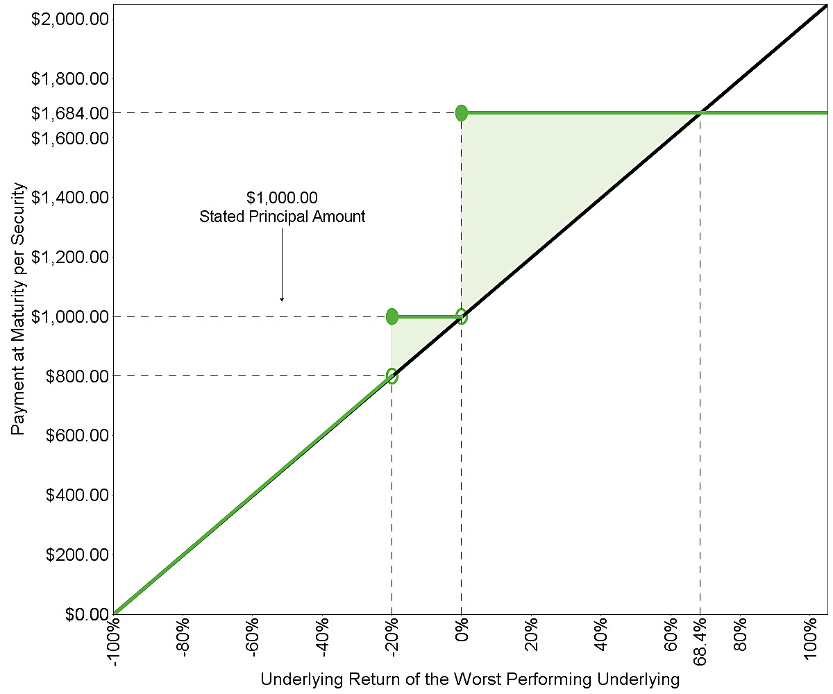 ▪The securities offer the potential for automatic early redemption at a premium following the first valuation date (other than the final valuation date) on which the closing value of the worst performing underlying on that valuation date is greater than or equal to its initial underlying value. If the securities are not automatically redeemed prior to maturity, the securities will provide for (i) repayment of the stated principal amount plus a premium at maturity if the final underlying value of the worst performing underlying on the final valuation date is greater than or equal to its initial underlying value or (ii) repayment of the stated principal amount at maturity, with no premium, if the final underlying value of the worst performing underlying on the final valuation date is less than its initial underlying value but greater than or equal to its final barrier value specified below. However, if the securities are not automatically redeemed prior to maturity and the final underlying value of the worst performing underlying on the final valuation date is less than its final barrier value, you will lose 1% of the stated principal amount of your securities for every 1% by which its final underlying value is less than its initial underlying value.
