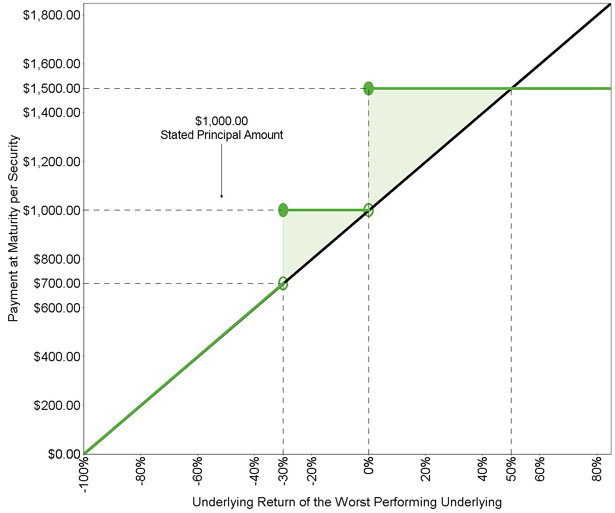 Example 3—Downside Scenario. The final underlying value of the worst performing underlying on the final valuation date is 30.00, resulting in a -70.00% underlying return for the worst performing underlying on the final valuation date. In this example, the final underlying value of the worst performing underlying on the final valuation date is less than its final barrier value.