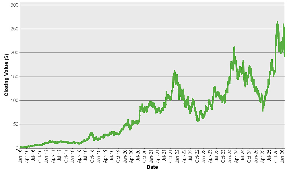 The graph below shows the closing value of Advanced Micro Devices, Inc. for each day such value was available from January 4, 2016 to February 9, 2026. We obtained the closing values from Bloomberg L.P., without independent verification. If certain corporate transactions occurred during the historical period shown below, including, but not limited to, spin-offs or mergers, then the closing values shown below for the period prior to the occurrence of any such transaction have been adjusted by Bloomberg L.P. as if any such transaction had occurred prior to the first day in the period shown below. You should not take historical closing values as an indication of future performance.