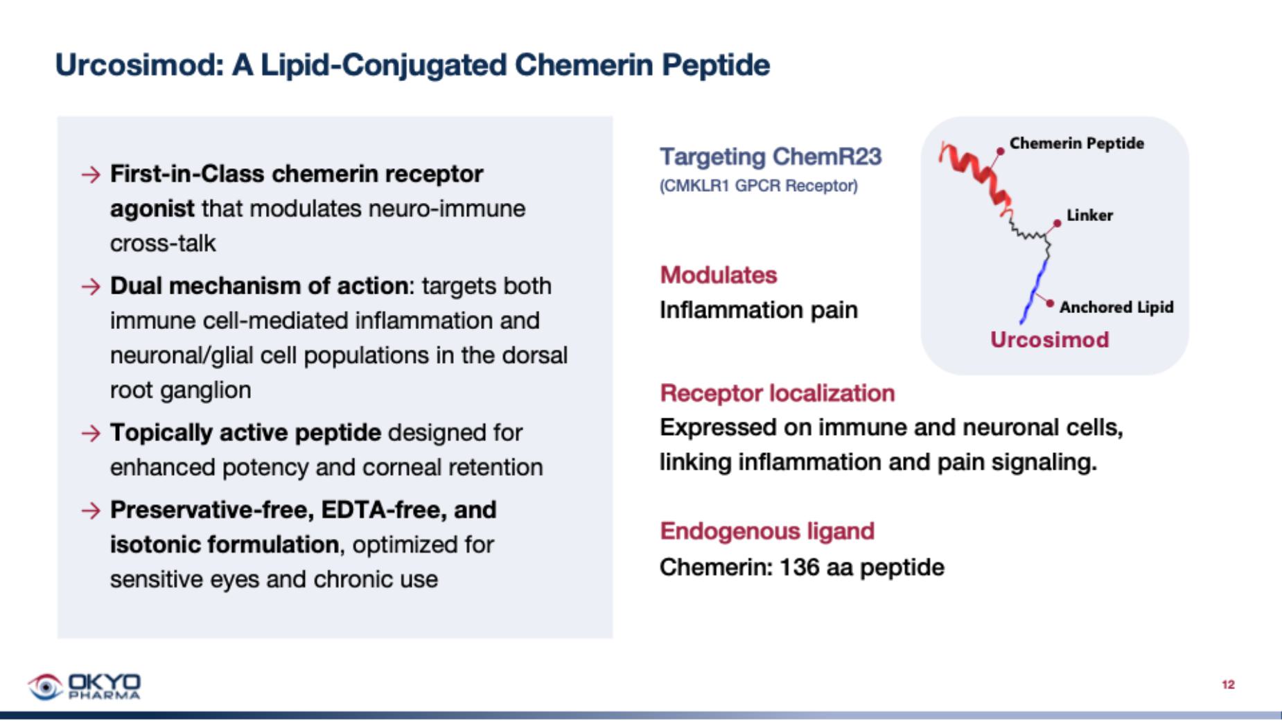 We are a clinical-stage biopharmaceutical company developing next-generation therapeutics to improve the lives of patients suffering from underserved rare ocular diseases. Our research program focuses on a novel G Protein-Coupled Receptor (“GPCR”), which we believe plays a key role in the pathology of corneal and anterior segment diseases of high unmet medical need. Our therapeutic approach involves targeting a specific member of this class of GPCR receptors called CMKLR1 (“ChemR23”) that is involved in the inflammatory and pain modulation pathways that drive these conditions. Our lead clinical product candidate, urcosimod (formerly called OK-101), is a lipidated peptide designed to specifically bind to ChemR23 and block its role in producing ocular pain and inflammation.