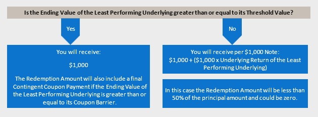 Because the Notes are linked to the least performing (and not the average performance) of the Underlyings, you may not receive any return on the Notes and may lose a significant portion or all of your principal amount even if the Observation Value or Ending Value of one Underlying is always greater than or equal to its Coupon Barrier or Threshold Value, as applicable. |