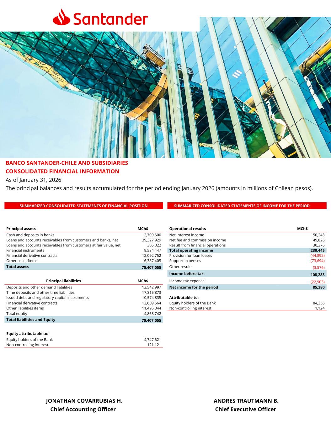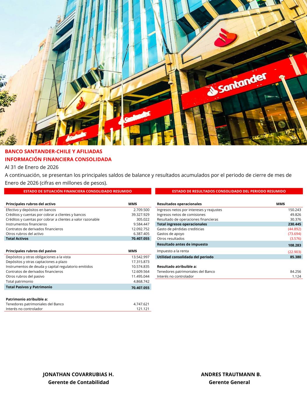 B ESTADO DE SITUACIÓN FINANCIERA CONSOLIDADO RESUMIDO ESTADO DE RESULTADOS CONSOLIDADO DEL PERIODO RESUMIDO Principales rubros del activo MM$ Resultados operacionales MM$ Efectivo y depósitos en bancos 2.709.500 Ingresos netos por intereses y reajustes 150.243 Créditos y cuentas por cobrar a clientes y bancos 39.327.929 Ingresos netos de comisiones 49.826 Créditos y cuentas por cobrar a clientes a valor razonable 305.022 Resultado de operaciones financieras 30.376 Instrumentos financieros 9.584.447 Total ingresos operacionales 230.445 Contratos de derivados financieros 12.092.752 Gasto de pérdidas crediticias (44.892) Otros rubros del activo 6.387.405 Gastos de apoyo (73.694) Total Activos 70.407.055 Otros resultados (3.576) Resultado antes de impuesto 108.283 Principales rubros del pasivo MM$ Impuesto a la renta (22.903) Depósitos y otras obligaciones a la vista 13.542.997 Utilidad consolidada del periodo 85.380 Depósitos y otras captaciones a plazo 17.315.873 Instrumentos de deuda y capital regulatorio emitidos 10.574.835 Resultado atribuible a: Contratos de derivados financieros 12.609.564 Tenedores patrimoniales del Banco 84.256 Otros rubros del pasivo 11.495.044 Interés no controlador 1.124 Total patrimonio 4.868.742 Total Pasivos y Patrimonio 70.407.055 Patrimonio atribuible a: Tenedores patrimoniales del Banco 4.747.621 Interés no controlador 121.121 BANCO SANTANDER-CHILE Y AFILIADAS INFORMACIÓN FINANCIERA CONSOLIDADA Al 31 de Enero de 2026 A continuación, se presentan los principales saldos de balance y resultados acumulados por el periodo de cierre de mes de Enero de 2026 (cifras en millones de pesos). JONATHAN COVARRUBIAS H. ANDRES TRAUTMANN B. Gerente de Contabilidad Gerente General