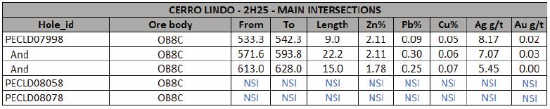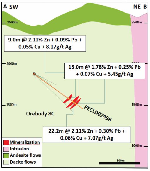 | · | Cerro Lindo - Orebody 8C: 22.2 meters at 2.11% Zn, 0.30% Pb, 0.06% Cu and 7.07 g/t Ag in drill hole PECLD07998 from 571.6 meters. |