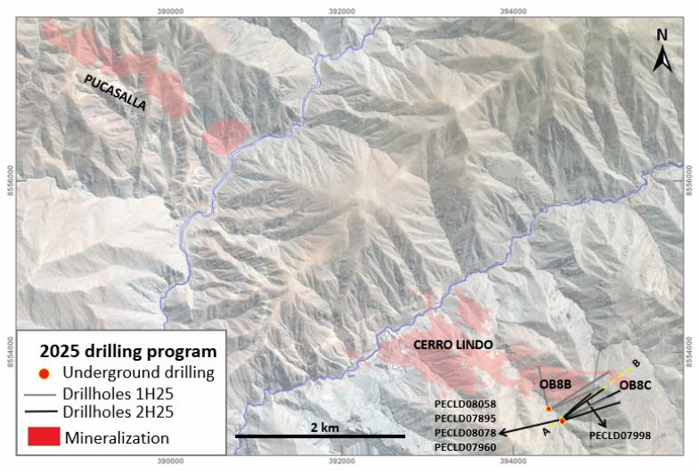 In the second half of 2025, the exploration program remained focused on expanding known orebodies southeast of Cerro Lindo, primarily targeting extensions of mineralized zones in Orebody 8C. A total of 2,017 meters of exploration drilling and 35,115 meters of infill drilling were completed. Drilling results from hole PECLD07998 confirmed the continuity of mineralization in Orebody 8C, with an intercept of 22.2 meters at 2.11% Zn, 0.30% Pb, 0.06% Cu and 7.07 g/t Ag.