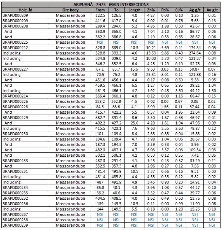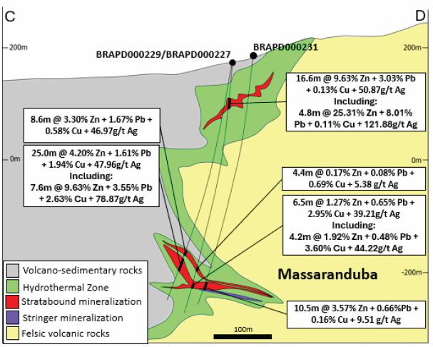 | · | Aripuanã - Massaranduba target: 16.6 meters at 9.63% Zn, 3.03% Pb, 0.13% Cu, and 50.87 g/t Ag, including 4.8 meters with 25.31% Zn, 8.01% Pb, 0.11% Cu, and 121.88 g/t Ag in drill hole BRAPD000227 from 67.1 meters. |