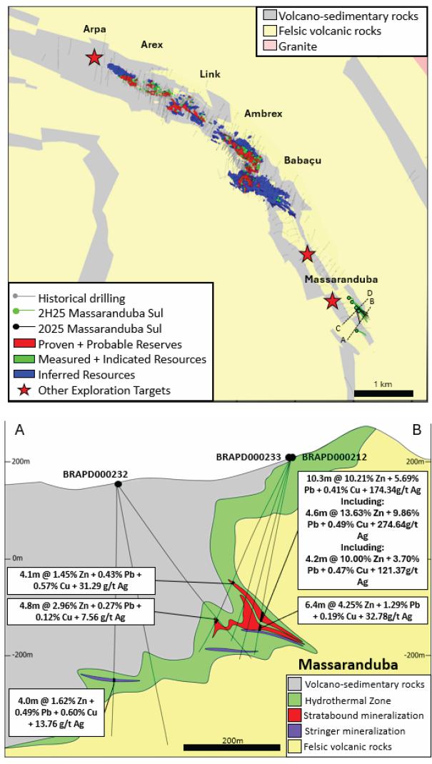 Results from drill hole BRAPD000227 confirmed the continuity of mineralization at the Massaranduba target, returning a significant intercept of 16.6 meters at attractive grades such as 9.63% Zn, 3.03% Pb, 0.13% Cu, and 50.87 g/t Ag. This includes a high-grade zone of 4.8 meters at 25.31% Zn, 8.01% Pb, 0.11% Cu, and 121.88 g/t Ag. These results reinforce the potential of Massaranduba to contribute to future Mineral Resource growth to enhance operational flexibility at Aripuanã.