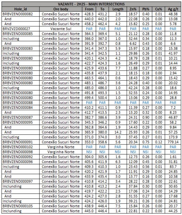 | · | Vazante - Conexão Sucuri Norte target: 14.2 meters at 25.93% Zn, 0.26% Pb, and 57.25 g/t Ag in drill hole BRBVZEND000095 from 365.9 meters. |