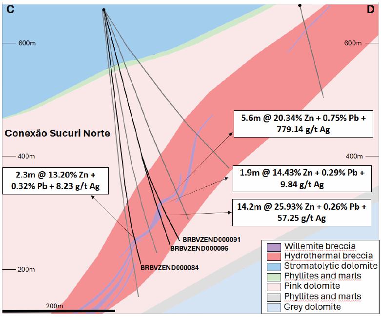 Drilling results from hole BRBVZEND000095 confirmed mineralization at the Conexão Sucuri Norte target, with an intercept of 14.2 meters at 25.93% Zn, 0.26% Pb, and 57.25 g/t Ag. These results reinforce the continuity of mineralization and the relevance of Conexão Sucuri Norte as a key contributor to the Vazante brownfield portfolio.