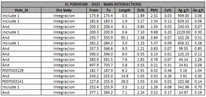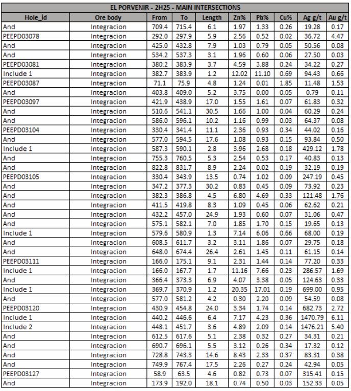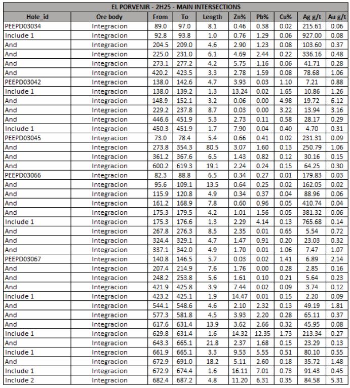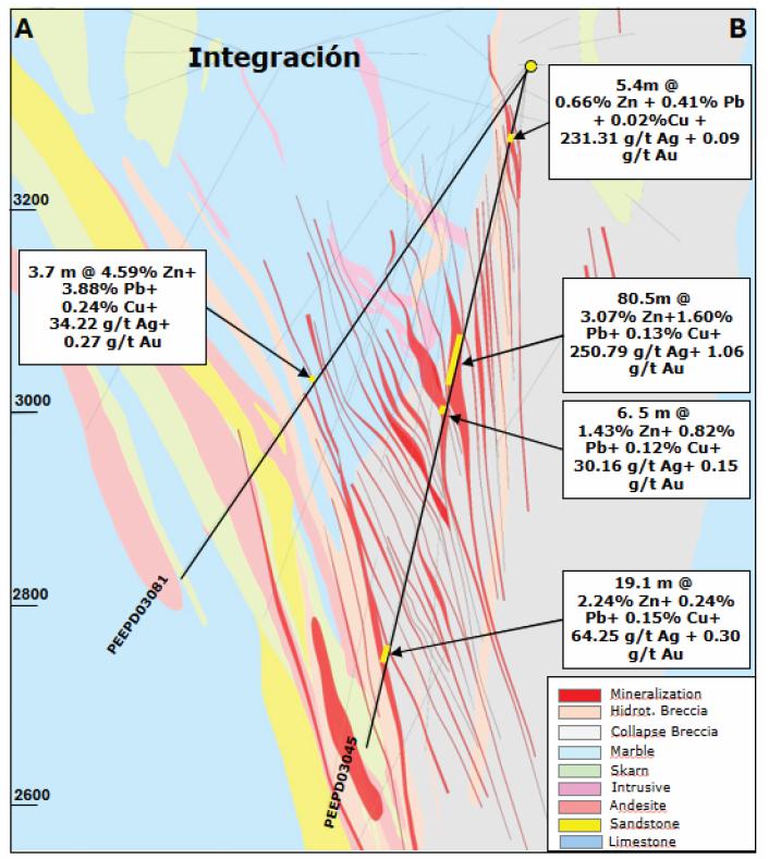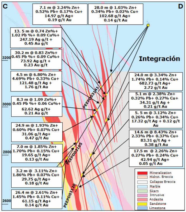 | · | El Porvenir - Integración target: 80.5 meters at 3.07% Zn, 1.60% Pb, 0.13% Cu, 250.79 g/t Ag, and 1.06 g/t Au, including 72.2 meters at 3.34% Zn, 1.75% Pb, 0.14% Cu, 277.38 g/t Ag in drill hole PEEPD03045 from 273.8 meters. |