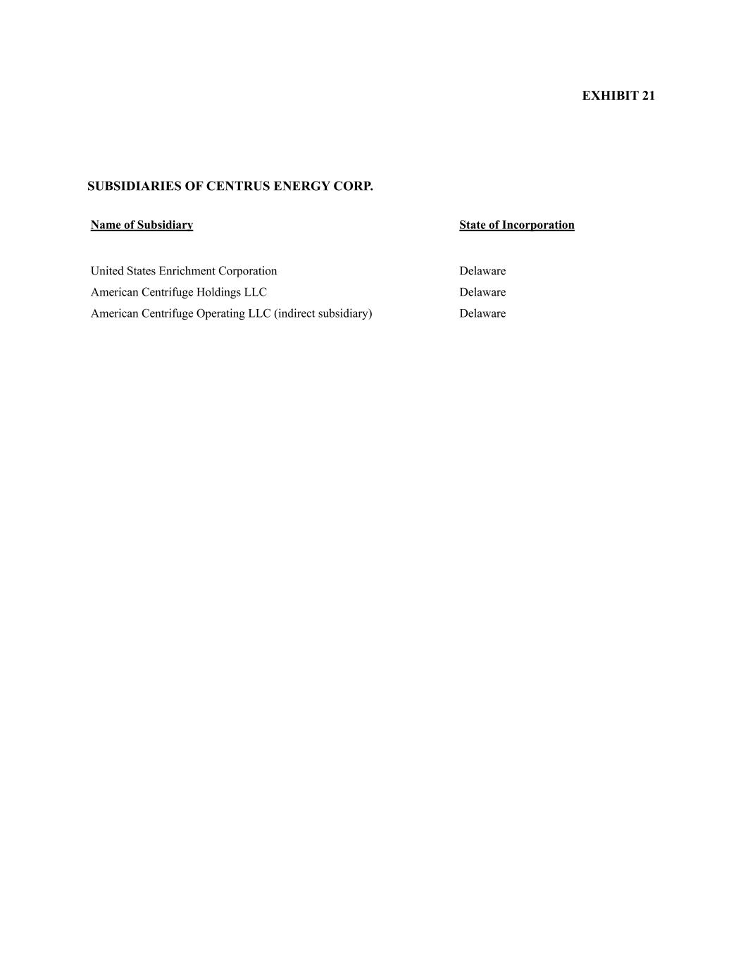 EXHIBIT 21 SUBSIDIARIES OF CENTRUS ENERGY CORP. Name of Subsidiary State of Incorporation United States Enrichment Corporation Delaware American Centrifuge Holdings LLC Delaware American Centrifuge Operating LLC (indirect subsidiary) Delaware
