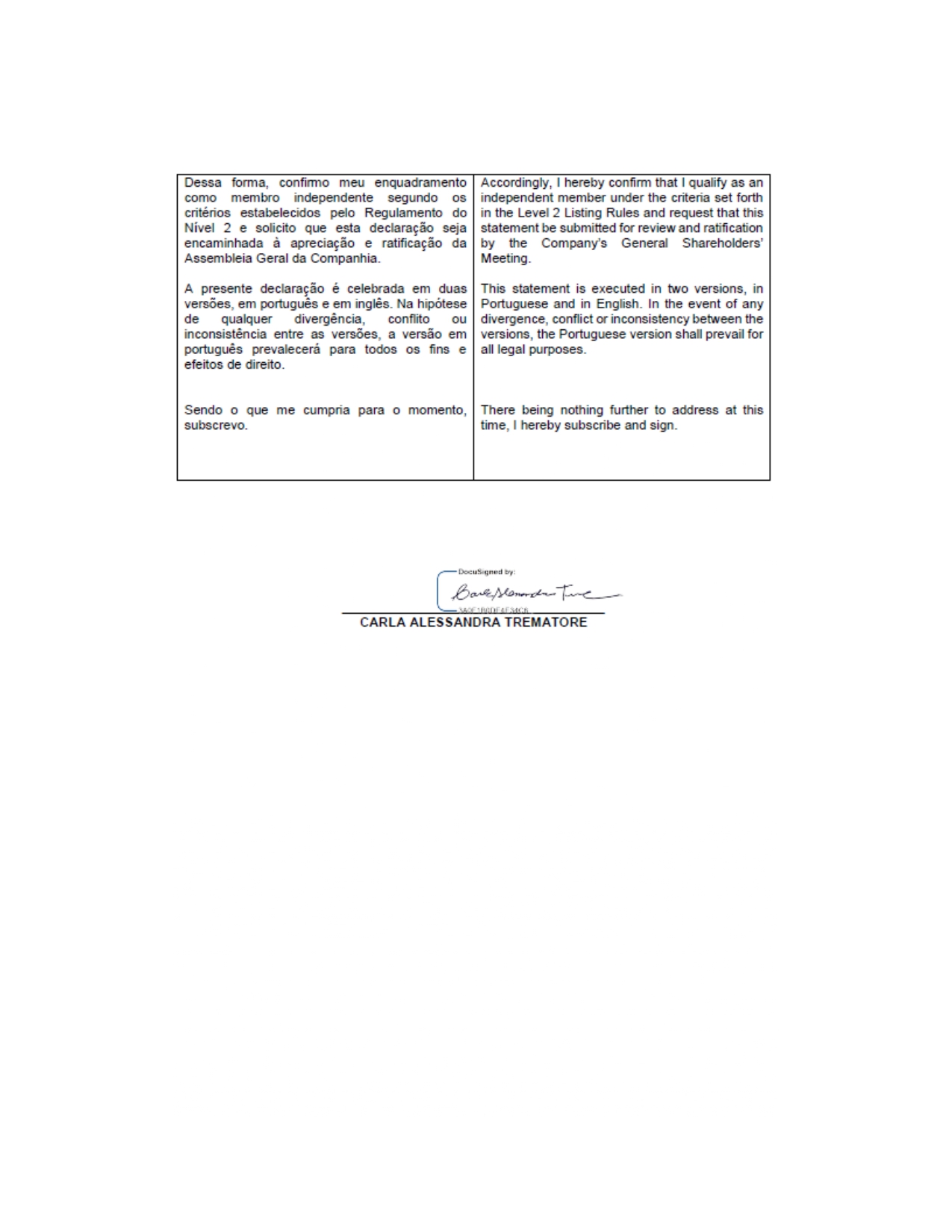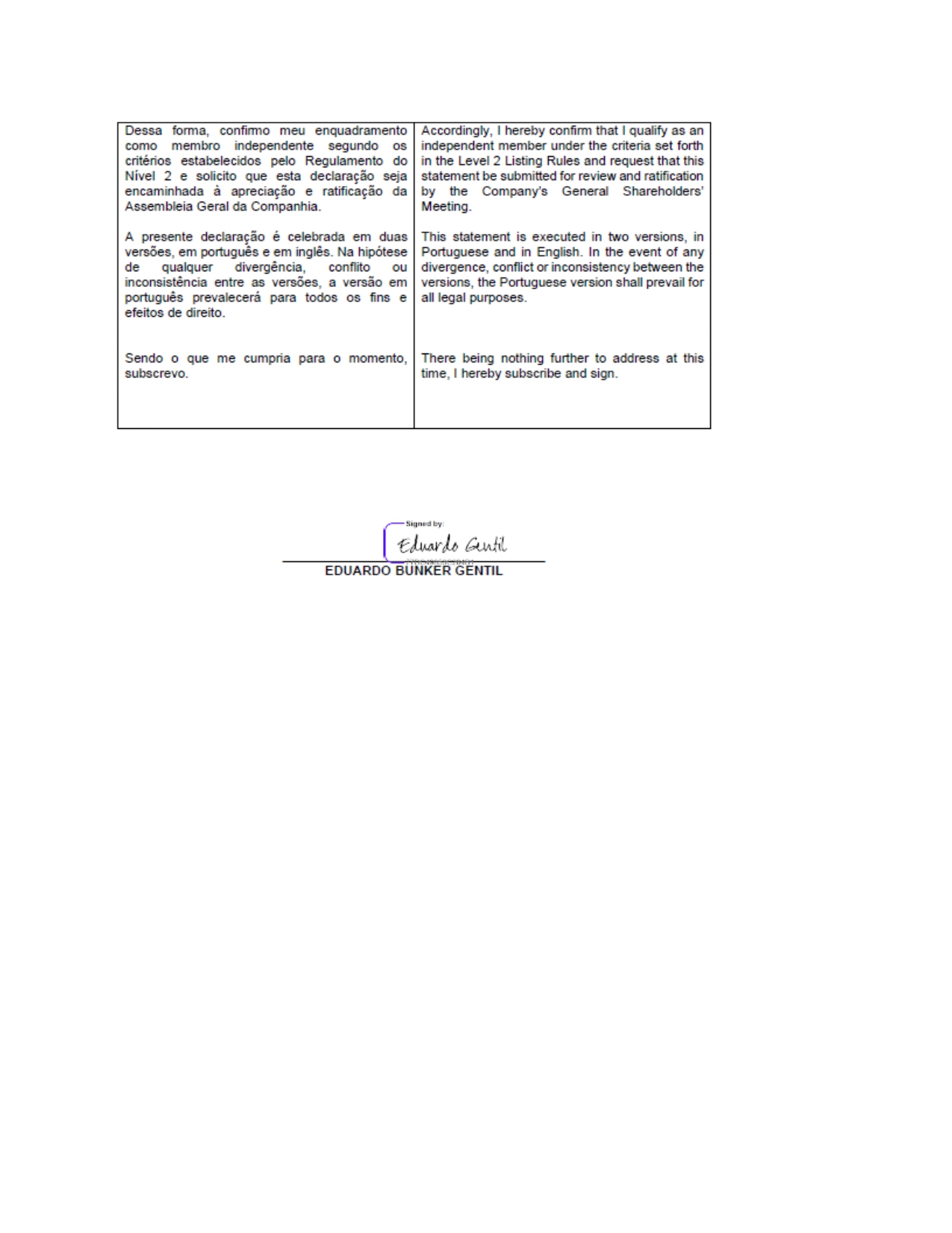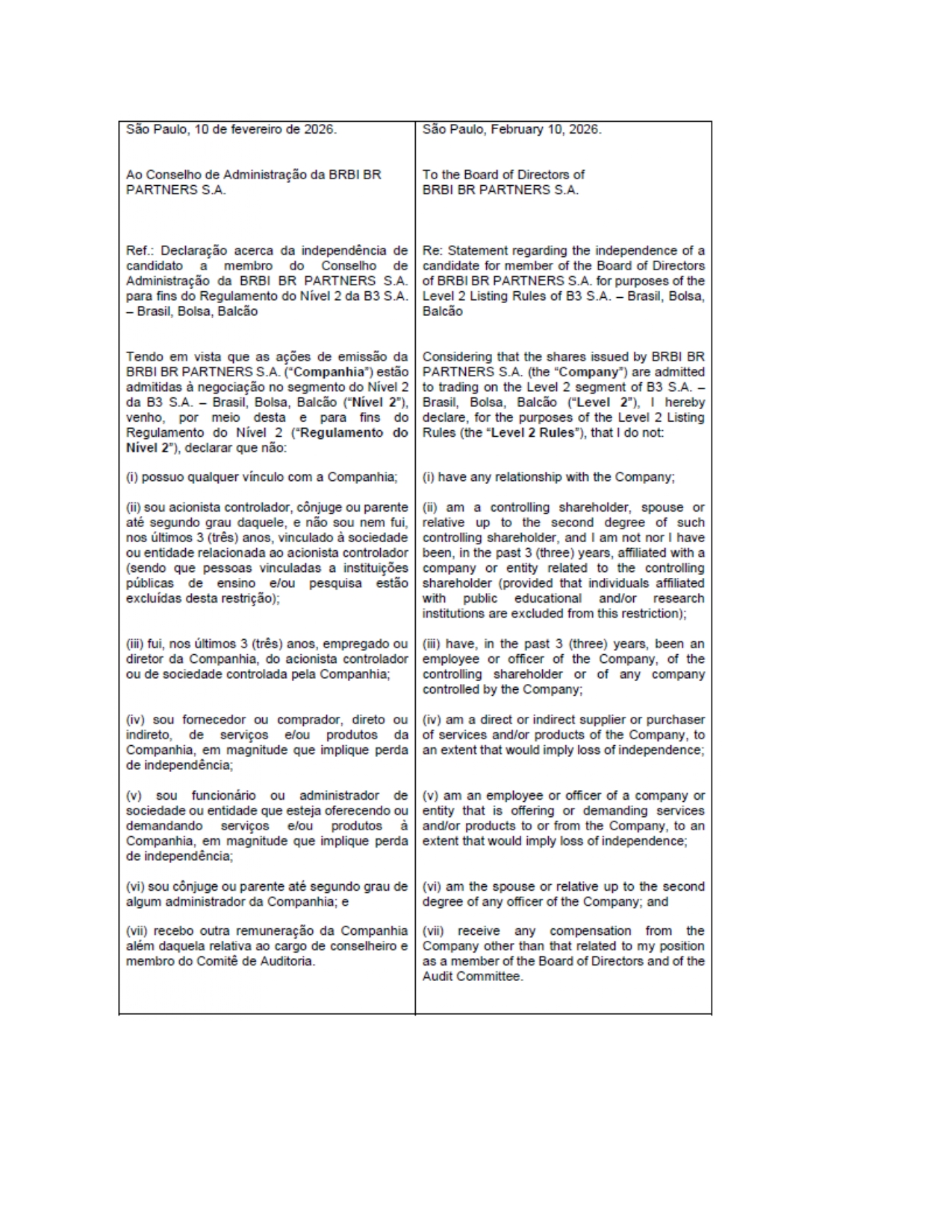 Furthermore, the Company presents, in ANNEX IV to this Administration Proposal, the statements of the candidates for independent members of the Board of Directors submitted to the Company, attesting to their compliance with the independence criteria set forth in the Level 2 Regulation of B3 S.A. – Brasil, Bolsa, Balcão.