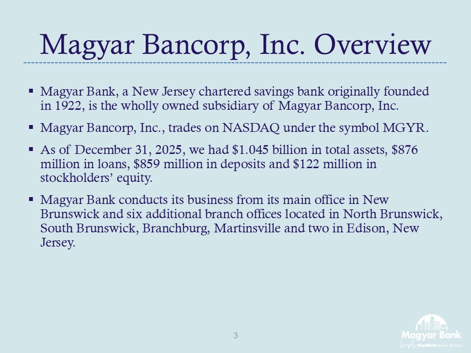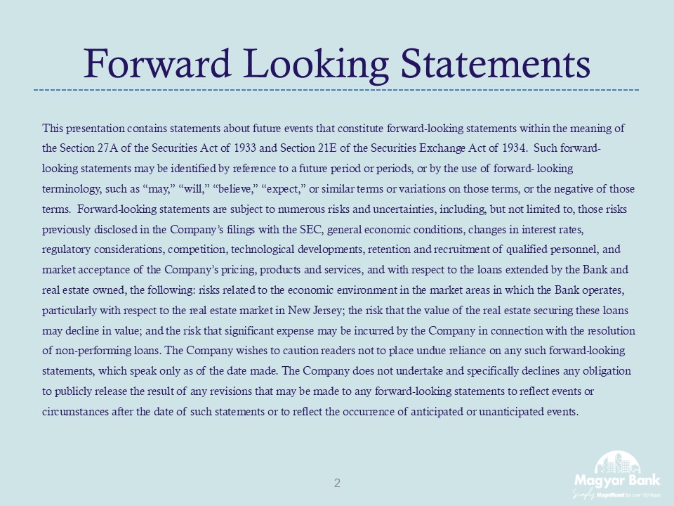 Forward Looking Statements This presentation contains statements about future events that constitute forward - looking statements within the meaning of the Section 27A of the Securities Act of 1933 and Section 21E of the Securities Exchange Act of 1934. Such forward - looking statements may be identified by reference to a future period or periods, or by the use of forward - looking terminology, such as “may,” “will,” “believe,” “expect,” or similar terms or variations on those terms, or the negative of th ose terms. Forward - looking statements are subject to numerous risks and uncertainties, including, but not limited to, those risks previously disclosed in the Company’s filings with the SEC, general economic conditions, changes in interest rates, regulatory considerations, competition, technological developments, retention and recruitment of qualified personnel, and market acceptance of the Company’s pricing, products and services, and with respect to the loans extended by the Bank and real estate owned, the following: risks related to the economic environment in the market areas in which the Bank operates, particularly with respect to the real estate market in New Jersey; the risk that the value of the real estate securing these loa ns may decline in value; and the risk that significant expense may be incurred by the Company in connection with the resolution of non - performing loans. The Company wishes to caution readers not to place undue reliance on any such forward - looking statements, which speak only as of the date made. The Company does not undertake and specifically declines any obligation to publicly release the result of any revisions that may be made to any forward - looking statements to reflect events or circumstances after the date of such statements or to reflect the occurrence of anticipated or unanticipated events. 2