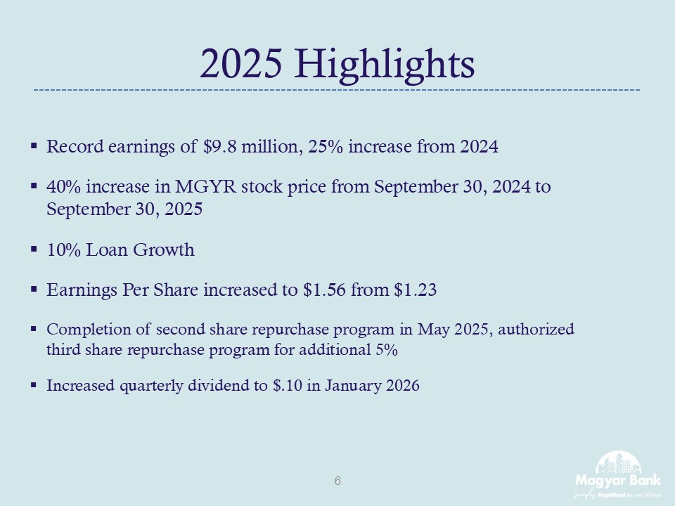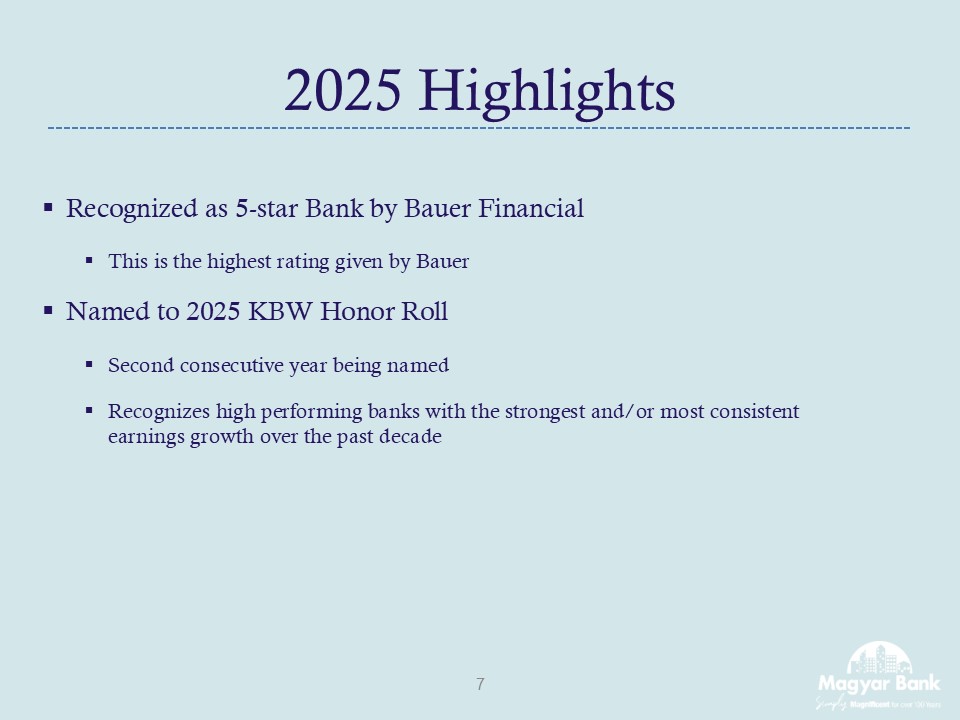 2025 Highlights ▪ Record earnings of $9.8 million, 25% increase from 2024 ▪ 40% increase in MGYR stock price from September 30, 2024 to September 30, 2025 ▪ 10% Loan Growth ▪ Earnings Per Share increased to $1.56 from $1.23 ▪ Completion of second share repurchase program in May 2025, authorized third share repurchase program for additional 5% ▪ Increased quarterly dividend to $.10 in January 2026 6