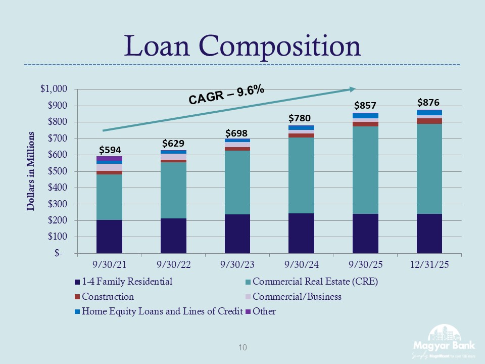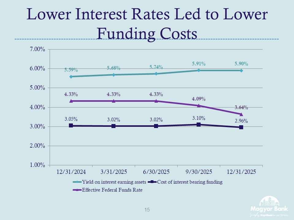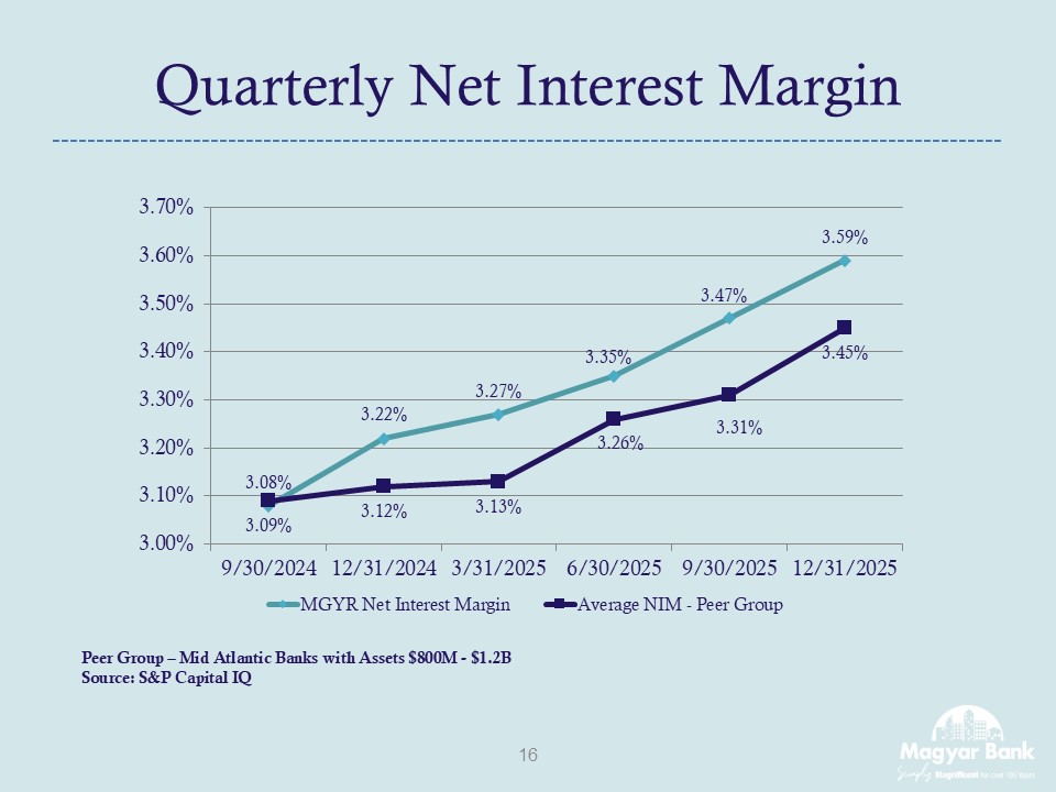 Quarterly Net Interest Margin 3.08% 3.22% 3.27% 3.35% 3.47% 3.59% 3.09% 3.12% 3.13% 3.26% 3.31% 3.45% 3.00% 3.10% 3.20% 3.30% 3.40% 3.50% 3.60% 3.70% 9/30/2024 12/31/2024 3/31/2025 6/30/2025 9/30/2025 12/31/2025 MGYR Net Interest Margin Average NIM - Peer Group 16 Peer Group – Mid Atlantic Banks with Assets $800M - $1.2B Source: S&P Capital IQ