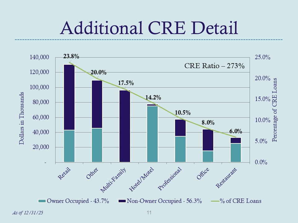 Additional CRE Detail 23.8% 20.0% 17.5% 14.2% 10.5% 8.0% 6.0% 0.0% 5.0% 10.0% 15.0% 20.0% 25.0% - 20,000 40,000 60,000 80,000 100,000 120,000 140,000 Percentage of CRE Loans Dollars in Thousands Owner Occupied - 43.7% Non-Owner Occupied - 56.3% % of CRE Loans 11 CRE Ratio – 273% As of 12/31/25